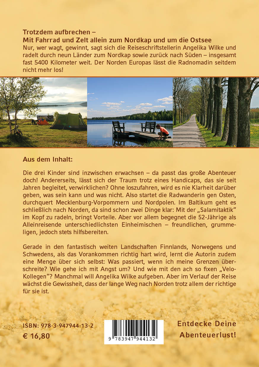 Mit Fahrrad und Zelt allein zum Nordkap und um die Ostsee Nur, wer wagt, gewinnt, sagt sich die Reiseschriftstellerin Angelika Wilke und radelt durch neun Länder zum Nordkap sowie zurück nach Süden - insgesamt fast 5400 Kilometer weit. Der Norden Europas lässt die Radnomadin seitdem nicht mehr los!