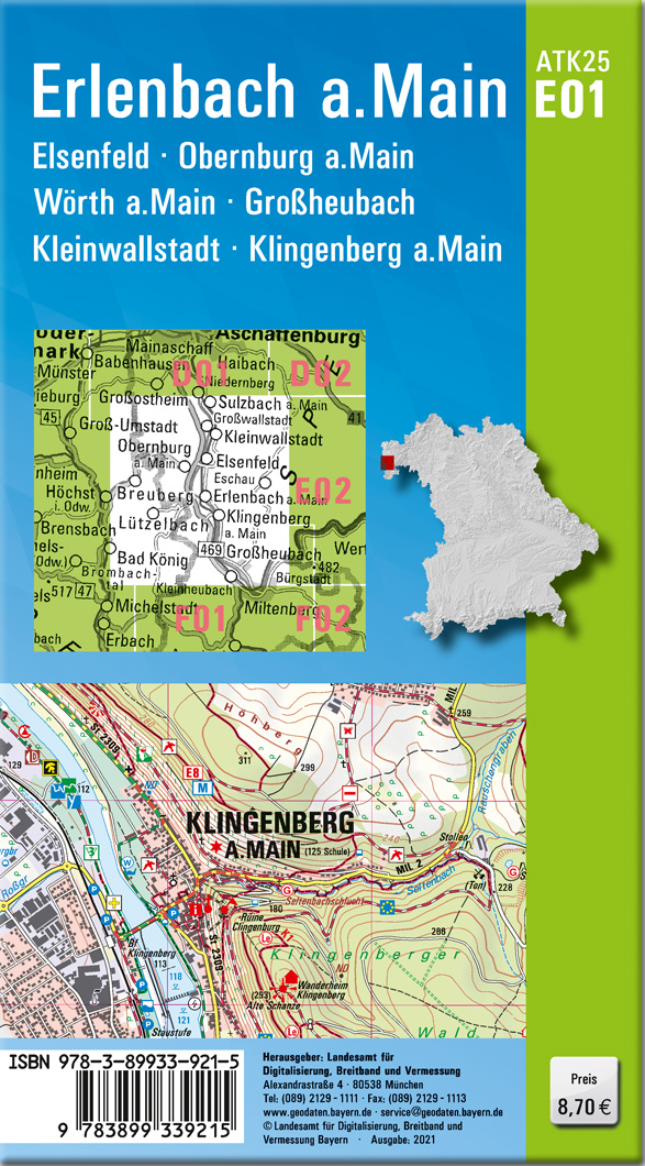 Wer es genau wissen will, greift zur ATK25. Diese Kartenserie im Maßstab 1:25000 bildet mit ihrer detaillierten Darstellung das komplette Verkehrsnetz mit allen Straßen und Wegen ab.237 Einzelblätter stellen Bayern flächendeckend dar. Ein Kartenblatt umfasst ca. 21 km x 22 km.Was bietet die ATK25?- individuelle Freizeitgestaltung mit allen ausgeschilderten Wander- und Radwanderwegen- sichere Orientierung auch abseits der markierten Routen- umfangreiches Spektrum an Freizeiteinrichtungen und Sehenswürdigkeiten- anschauliche Wiedergabe der GeländeformenKartenblatt ATK25-E01 Erlenbach a.Main:REGION: Unterfranken, Hessen, Spessart, Mainviereck, OdenwaldORTE: Erlenbach a.Main, Elsenfeld, Obernburg a.Main, Wörth a.Main, Großheubach, Kleinwallstadt, Klingenberg a.Main