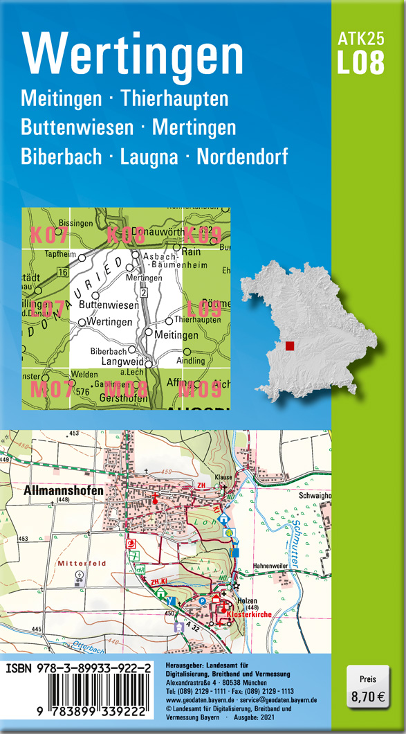 Wer es genau wissen will, greift zur ATK25. Diese Kartenserie im Maßstab 1:25000 bildet mit ihrer detaillierten Darstellung das komplette Verkehrsnetz mit allen Straßen und Wegen ab.237 Einzelblätter stellen Bayern flächendeckend dar. Ein Kartenblatt umfasst ca. 21 km x 22 km.Was bietet die ATK25?- individuelle Freizeitgestaltung mit allen ausgeschilderten Wander- und Radwanderwegen- sichere Orientierung auch abseits der markierten Routen- umfangreiches Spektrum an Freizeiteinrichtungen und Sehenswürdigkeiten- anschauliche Wiedergabe der GeländeformenKartenblatt ATK25-L08 Wertingen:REGION: Schwaben, Donauried, HolzwinkelORTE: Wertingen, Meitingen, Thierhaupten, Buttenwiesen, Mertingen, Biberbach, Laugna, Nordendorf, Langweid a.Lech