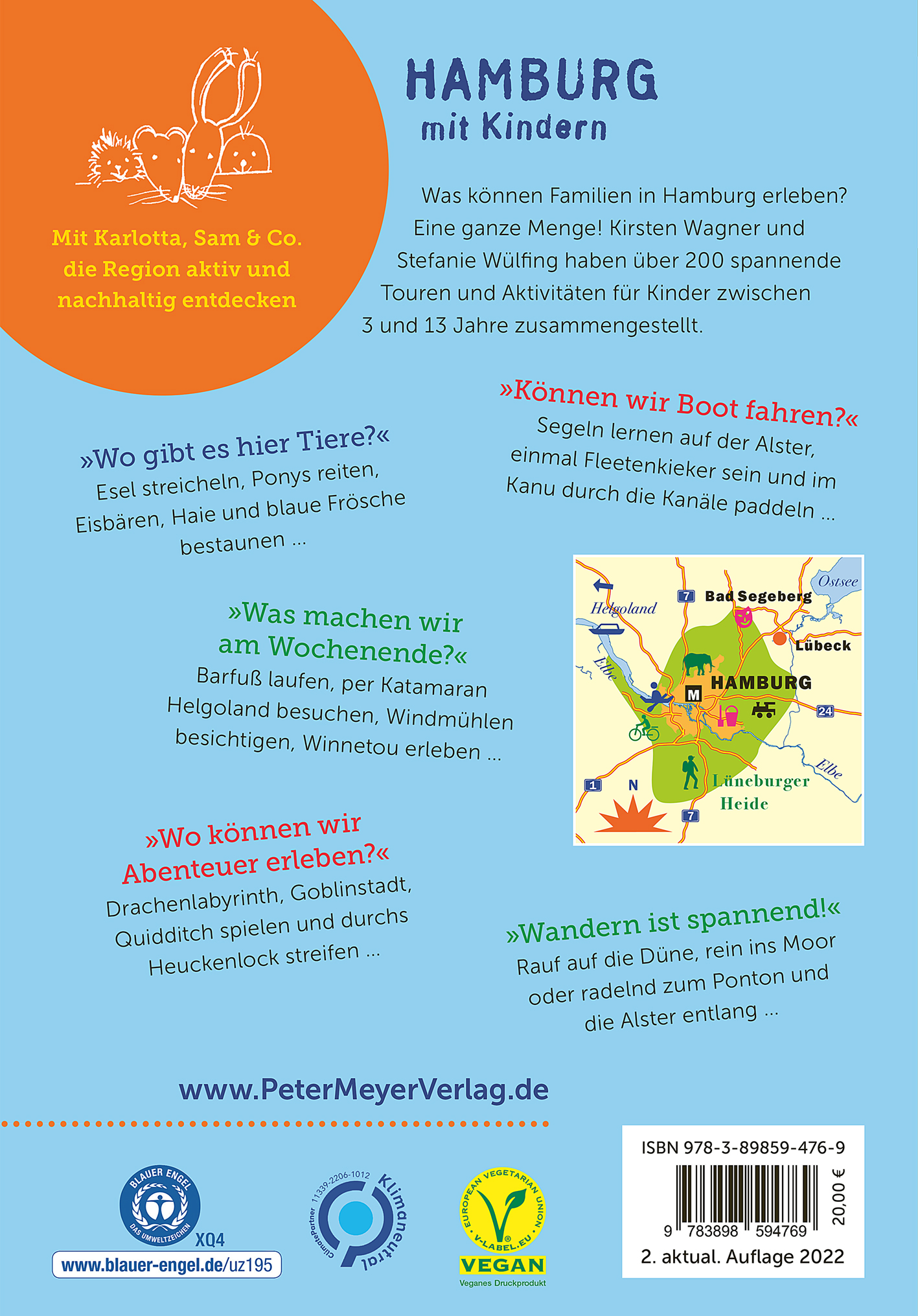 Was können Familien in Hamburg erleben? Eine ganze Menge! Kirsten Wagner und Stefanie Wülfing haben sich mit ihren Kindern auf Recherche begeben: Über 200 spannende Touren und Aktivitäten für Kinder zwischen 3 und 13 Jahre haben sie hier zusammengestellt. Umweltfreundliche Ausflüge in die Natur, Wanderungen und Radtouren sind das Herzstück ihres Freizeitführers.
