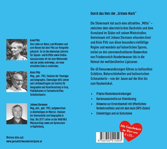 Durch das Herz der "Grünen Mark"Die Steiermark hat auch eine attraktive "Mitte" - zwischen dem obersteirischen Dachstein und dem Grenzland im Süden mit seinen Weinstraßen. Gemeinsam mit Johann Dormann erkunden Anni und Alois Pötz nun diese besonders vielfältige Region des flächenmäßig zweitgrößten Bundeslandes Österreichs. Sie begleiten uns auf gehmütlichen Wegen abseits von touristischen Trampelpfaden zu ganz besonderen Ausflugszielen, z. B.- auf den Spuren von Kaiser Karl I. im Joglland,- zur Obstblüte in Pöllau und im Apfelland,- zu romantischen Schlössern und geschichtsträchtigen Klöstern,- durch das UNESCO-Weltkulturerbe Graz,- in die Heimat der eleganten, weltberühmten Lipizzaner,- auf Almen mit Panoramablick,- zu den Hängenden Gärten der Sulamith in St. Kathrein,- in ein österreichweit einzigartiges Theaterdorf,- zu kreativen Bauwerken von Friedensreich Hundertwasseru. v. m.Die 40 Genusswanderungen führen zu Naturschönheiten, kulturellen Schätzen und natürlich zu kulinarischen Schmankerln - von der Jause auf der Alm bis zum Haubenlokal.- Präzise Routenbeschreibungen- Kartenausschnitte zur Orientierung- Hinweise zur Erreichbarkeit mit öffentlichen Verkehrsmitteln und mit dem Auto (GPS-Daten)- Einkehrtipps und 40 Gutscheine