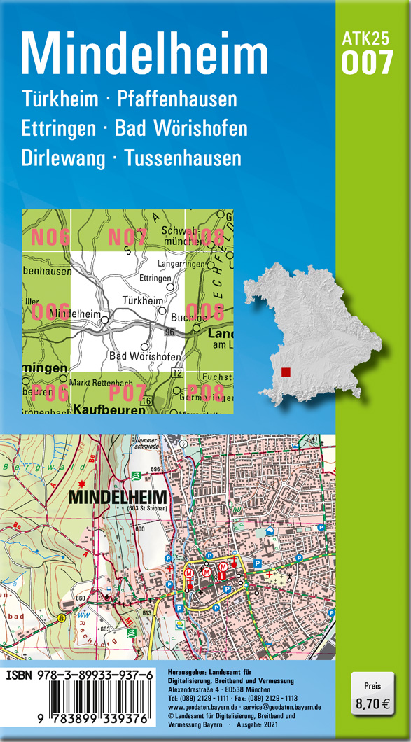 Wer es genau wissen will, greift zur ATK25. Diese Kartenserie im Maßstab 1:25000 bildet mit ihrer detaillierten Darstellung das komplette Verkehrsnetz mit allen Straßen und Wegen ab.237 Einzelblätter stellen Bayern flächendeckend dar. Ein Kartenblatt umfasst ca. 21 km x 22 km.Was bietet die ATK25?- individuelle Freizeitgestaltung mit allen ausgeschilderten Wander- und Radwanderwegen- sichere Orientierung auch abseits der markierten Routen- umfangreiches Spektrum an Freizeiteinrichtungen und Sehenswürdigkeiten- anschauliche Wiedergabe der GeländeformenKartenblatt ATK25-O07 Mindelheim:REGION: Schwaben, Allgäu, StaudenORTE: Mindelheim, Türkheim, Pfaffenhausen, Ettringen, Bad Wörishofen, Dirlewang, Tussenhausen, Markt Wald, Wiedergeltingen
