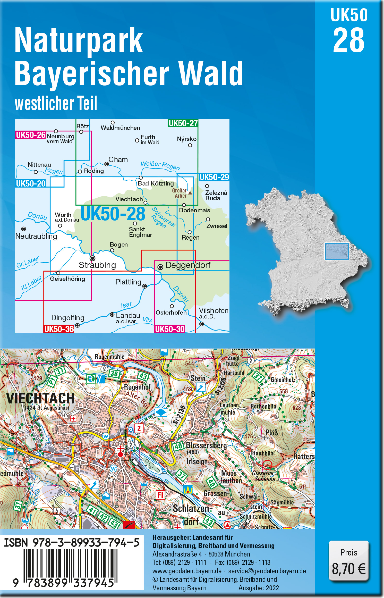 Die amtliche Reihe der UK50 (Umgebungskarte 1:50000) bietet für zusammenhängende bayerische Regionen gezielte Freizeitinformationen. Kartengrundlage ist die TK50 (Topographische Karte 1:50000) mit UTM-Gitter für GPS-Nutzer und Geländedarstellung.In der UK50-28 wird der westliche Teil des Naturparks Bayerischer Wald präsentiert. Die Landschaft ist sehr vielseitig: schöne Täler entlang der Donau, tolle Hügellandschaften im Falkensteiner Vorwald und die Berge im Bayerischen Wald.Radwege entlang der Donau und rund um Straubing sowie im Naturpark lassen keine Wünsche offen. Man hat die Wahl zwischen vielen Rad- und Fernradwegen. Dazu zählen z.B. der Donauradweg und der Grüne Dach Radweg. Für MTB-Fahrer sind die Touren in der Region Arberland und die Trans Bayerwald Routen im Naturpark zu empfehlen.Dem Wanderer bietet sich ebenso ein großes Angebot. Weitwanderer freuen sich z.B. über den Goldsteig, die Fernwanderwege E6 und E8 oder die Via Nova. Viele weitere schöne Wege eignen sich perfekt für Tagesauflüge. Besonders beliebt sind die Touren hinauf auf den Großen und Kleinen Arber sowie die dazugehörigen Seen.Freizeitanlagen und Ausflüge sind im ganzen Gebiet der UK50-28 zu finden. Kulturbegeisterte besuchen die Burg Falkenstein, die historische Altstadt von Straubing oder eines der Klöster in Oberalteich und Metten. Naturliebhaber bestaunen den Pfahl mit seinen außergewöhnlichen Felsformationen. Familien verbringen im Straubinger Tiergarten, im Churpfalzpark Loifling oder im Silberbergwerk Bodenmais schöne Stunden. Noch viel mehr bietet die Gemeinde Sankt Englmar. Z.B. Hochseilgarten, Sommerrodelbahn, Freilichtmuseum, Waldwipfelweg und Haus am Kopf.Kartenblatt UK50-28 Naturpark Bayerischer Wald - westlicher TeilREGIONEN: Oberpfalz, Niederbayern, Bayerischer Wald, Gäuboden, Lallinger Winkel, PfahlORTE: Straubing, Deggendorf, Regen, Bogen, Viechtach, Geiselhöring, Wörth a.d.Donau, Bodenmais, Sankt Englmar