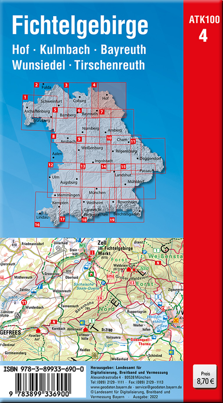 Für einen großräumigen Überblick bei weiten Touren liegt man mit der ATK100 genau richtig. Landschaftlich zusammenhängende Gebiete sind charakteristisch abgebildet, und der Karteninhalt ist auch im Maßstab 1 : 100 000 leicht verständlich.19 Einzelblätter stellen Bayern flächendeckend dar. Ein Kartenblatt umfasst ca. 85 km x 90 km.Was bietet die ATK100?- weiträumige Tourenplanung auf den ausgeschilderten Fernrad- und Fernwanderwegen- übersichtliche Darstellung großer Regionen- umfangreiches Spektrum an Freizeiteinrichtungen und Sehenswürdigkeiten- anschauliche Wiedergabe der GeländeformenDie ATK100-4 Fichtelgebirge im Maßstab 1:100 000 zeigt die Naturparke Fichtelgebirge und Frankenwald und erstreckt sich bis zu den benachbarten Regionen Thüringer Schiefergebirge, Vogtland und Egerland. Mehrere Bayernnetz-Radwege wie der MainRadweg oder der Brückenradweg Bayern-Böhmen bieten den Radlern abwechslungsreiche Touren durch faszinierende Landschaften an. Eine Etappe des Saaleradweges führt zudem an der Bleilochtalsperre entlang, dem größten Stausee Deutschlands. Über die rauen Höhen des Fichtelgebirges verläuft die Siebensterntour, vorbei an den Quellflüssen von Main, Saale, Eger und Naab. Die Qualitätswege Fränkischer Gebirgsweg und Frankenwald-Steig führen Wanderfreunde durch romantische Wälder mit zahlreichen Mooren, Flüssen und Seen.Kulturfreunde kommen in der Wagnerstadt Bayreuth mit dem Festspielhaus und der Eremitage auf ihre Kosten. Ebenso sehenswert sind auch der Bürgerpark Theresienstein in Hof oder die Wallfahrtskirche Kappl. Einen interessanten Einblick in die Geschichte der deutschen Teilung bietet das Deutsch-Deutsche Museum Mödlareuth. Die Festspiele auf der Luisenburg locken jedes Jahr viele Besucher nach Wunsiedel. Entspannung pur findet man in den zahlreichen Thermalbädern wie der Lohengrin Therme, der Siebenquell-Therme oder dem Sibyllenbad.Kartenblatt ATK100-4 Fichtelgebirge:REGIONEN: Oberfranken, Oberpfalz, Naturpark Frankenwald, Naturpark Fichtelgebirge, Sechsämterland, Stiftland, Naab-Wondreb-Senke, Hessenreuther Wald, Oberpfälzer Wald, VogtlandORTE: Hof, Bayreuth, Kulmbach, Selb, Marktredwitz, Windischeschenbach, Tirschenreuth, Speichersdorf, Cheb, Plauen