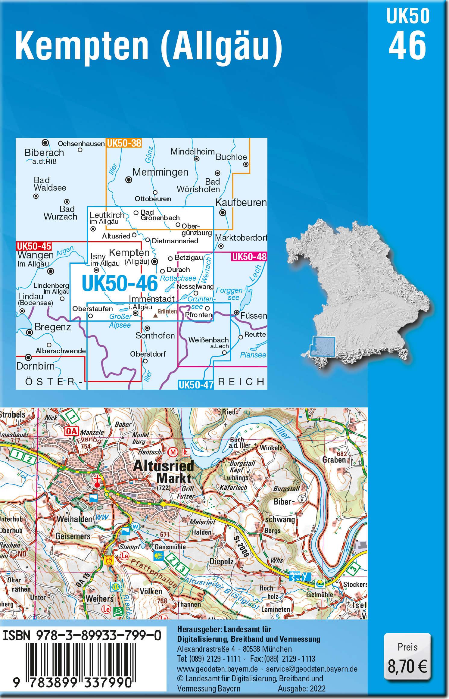 Die amtliche Reihe der UK50 (Umgebungskarte 1:50000) bietet für zusammenhängende bayerische Regionen gezielte Freizeitinformationen. Kartengrundlage ist die TK50 (Topographische Karte 1:50000) mit UTM-Gitter für GPS-Nutzer und Geländedarstellung.Im Kartenblatt UK50-46 bildet Kempten (Allgäu), eine der ältesten Städte Deutschlands, das Zentrum. Im Osten des Blattes erstreckt sich der Kempter Wald und die Wertach. Im Süden haben wir die Berge bei Pfronten und einen kleinen nördlichen Teil des Naturparks Nagelfluhkette. Vom Grünten Richtung Westen schwingen sich die Höhenrücken wie Wellen immer höher empor. Radfahrer finden besonders hier im Herzen des Allgäus ihren Spaß. Viele schöne Radwege wie Bodensee Königssee-Radweg, Radrunde Allgäu oder die Wege der Landkreise Unter-, Ober-, und Ostallgäu führen zu den zahlreichen sehenswerten Orten. Auf dem Iller-Radweg passiert man direkt den beeindruckenden Illerdurchbruch bei Altusried. Über zahlreiche Treppen gelangt man auf einem malerischen Weg hinunter zur Iller. Der Fernwanderweg Bayerisch Schwäbischer Jakobusweg führt dort vorbei. Für Wanderer empfehlen sich zur Erkundung der Region der Münchner Jakobsweg und die Wege der Wandertrilogie Allgäu. Perfekt für Tagestouren eignen sich die vielen kürzeren Wege.Erfrischungen für Radler und Wanderer bieten Badeseen wie der Rottachsee, Grüntensee, Großer Alpsee und Niedersonthofener See. Den ultimativen Freizeitspaß hat man bei der schnellsten Zipline Deutschlands, der AlpspitzKick bei Nesselwang. Einen entspannten Ausflug machen Familien in die Schmetterling Erlebniswelt bei Pfronten.Kartenblatt UK50-46 Kempten (Allgäu)REGIONEN: Schwaben, Baden-Württemberg, Allgäu, Oberschwaben, Kempter WaldORTE: Kempten, Leutkirch, Immenstadt, Altusried, Pfronten, Dietmannsried, Oberstaufen, Obergünzburg, Durach, Bad Grönenbach, Nesselwang, Betzigau, Grünten