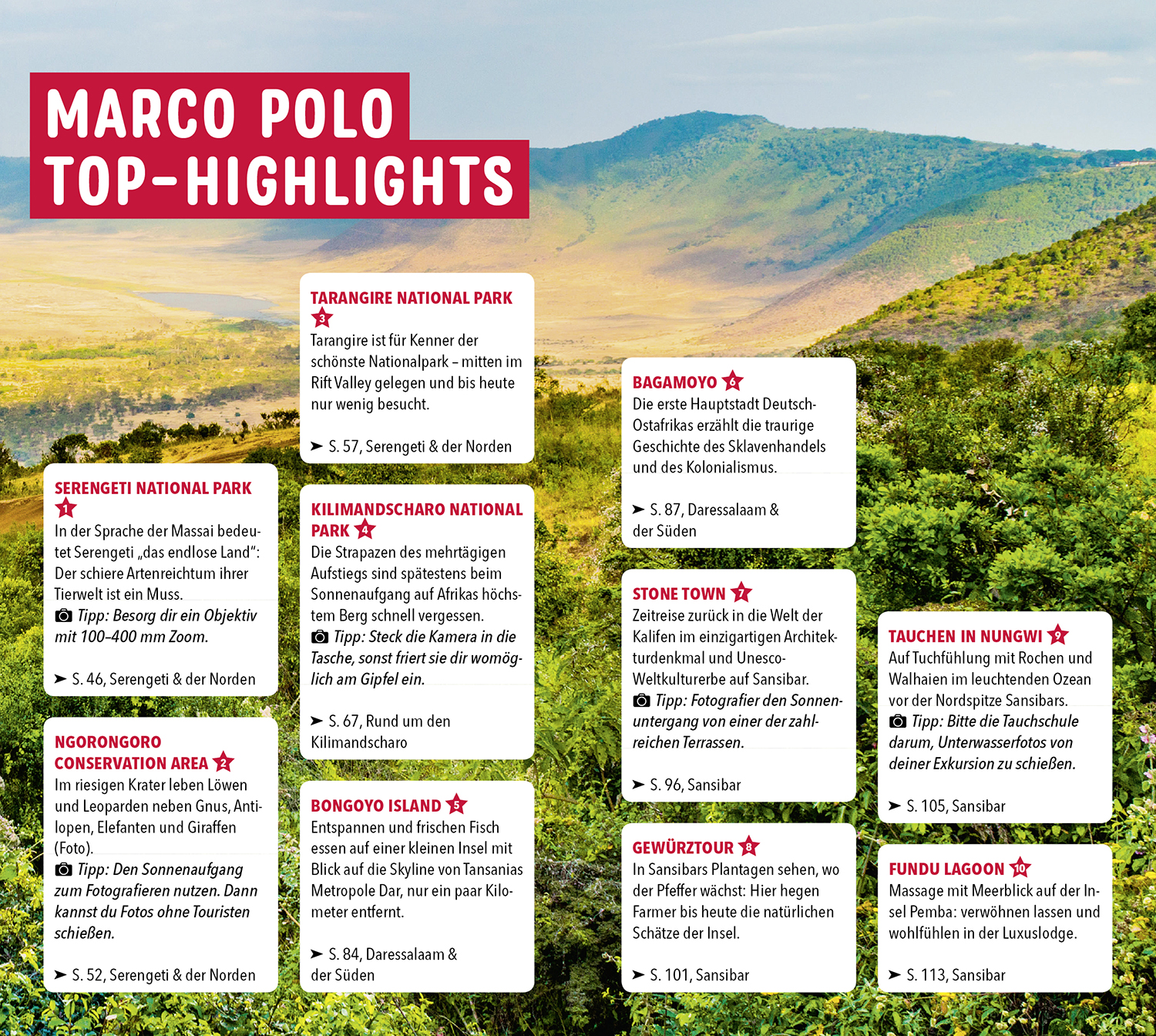 Genieße weite Strände, exotische Düfte und Bongo-Beats in Tansania und Sansibar! Mit dem MARCO POLO Reiseführer im Gepäck zeigt sich Ostafrika von seiner schönsten Seite.