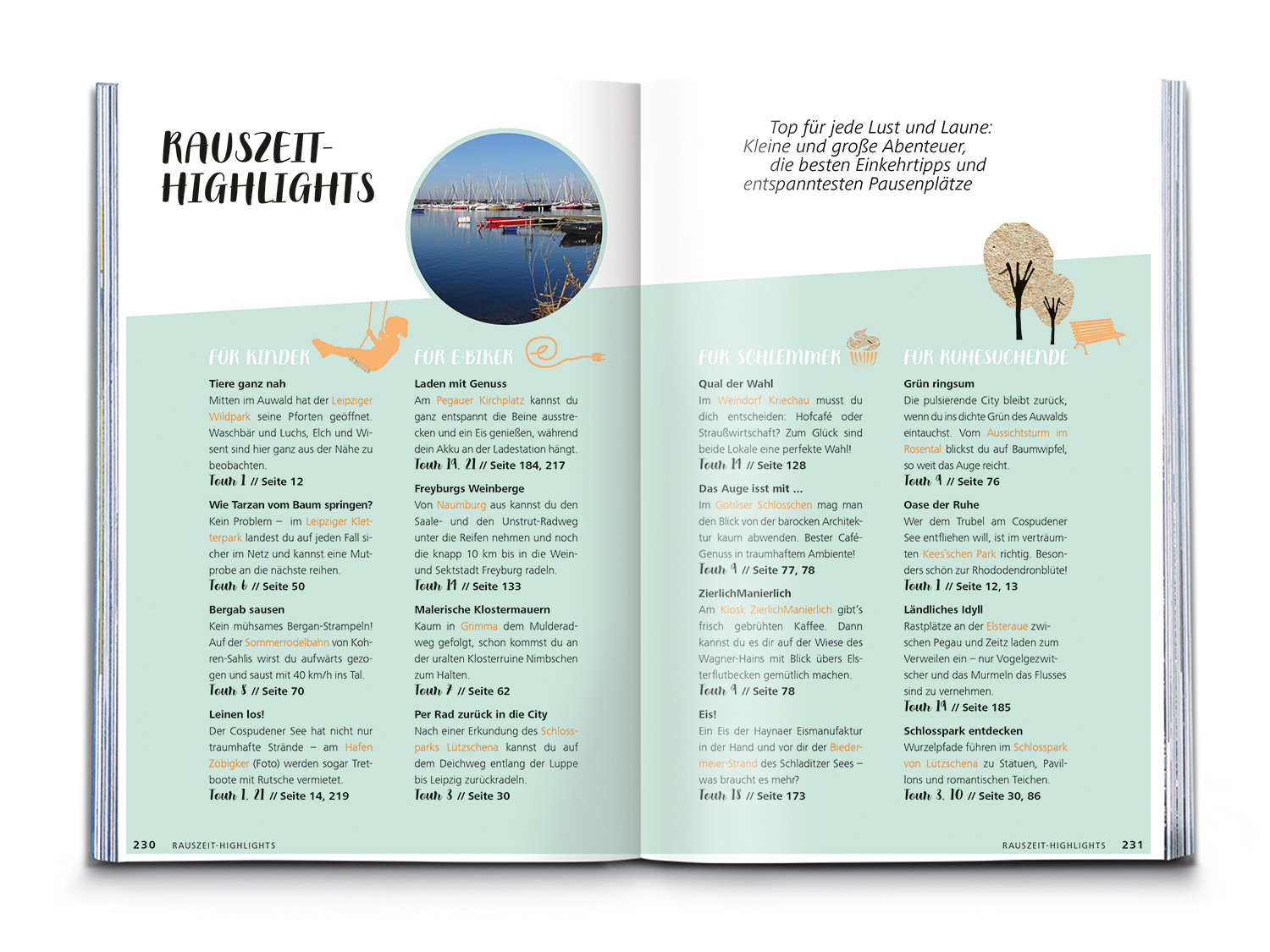 Dank Eventkalender planst du deine Route immer zur besten Zeit und mit Radcheck und Packliste bist du bestens gerüstet fürs Heimat- oder Urlaubsabenteuer. Highlight-Listen für Kinder, E-Biker, Schlemmer und Ruhesuchende helfen bei der Tourenauswahl. Jede Tour wird ergänzt um Einkehrtipps, Anreiseinfos, Höhenprofil und Tourenkarte.