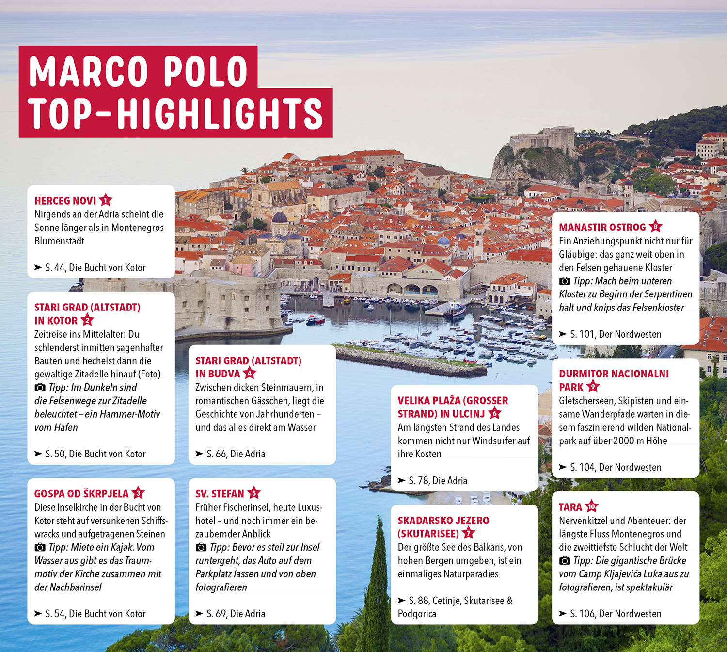 Ob entspannter Badeurlaub, Architektur-Genuss pur oder Wander-Highlights am laufenden Band: Dein MARCO POLO Reiseführer ist der ideale Begleiter, wenn du die schönsten Seiten Montenegros erkunden willst.