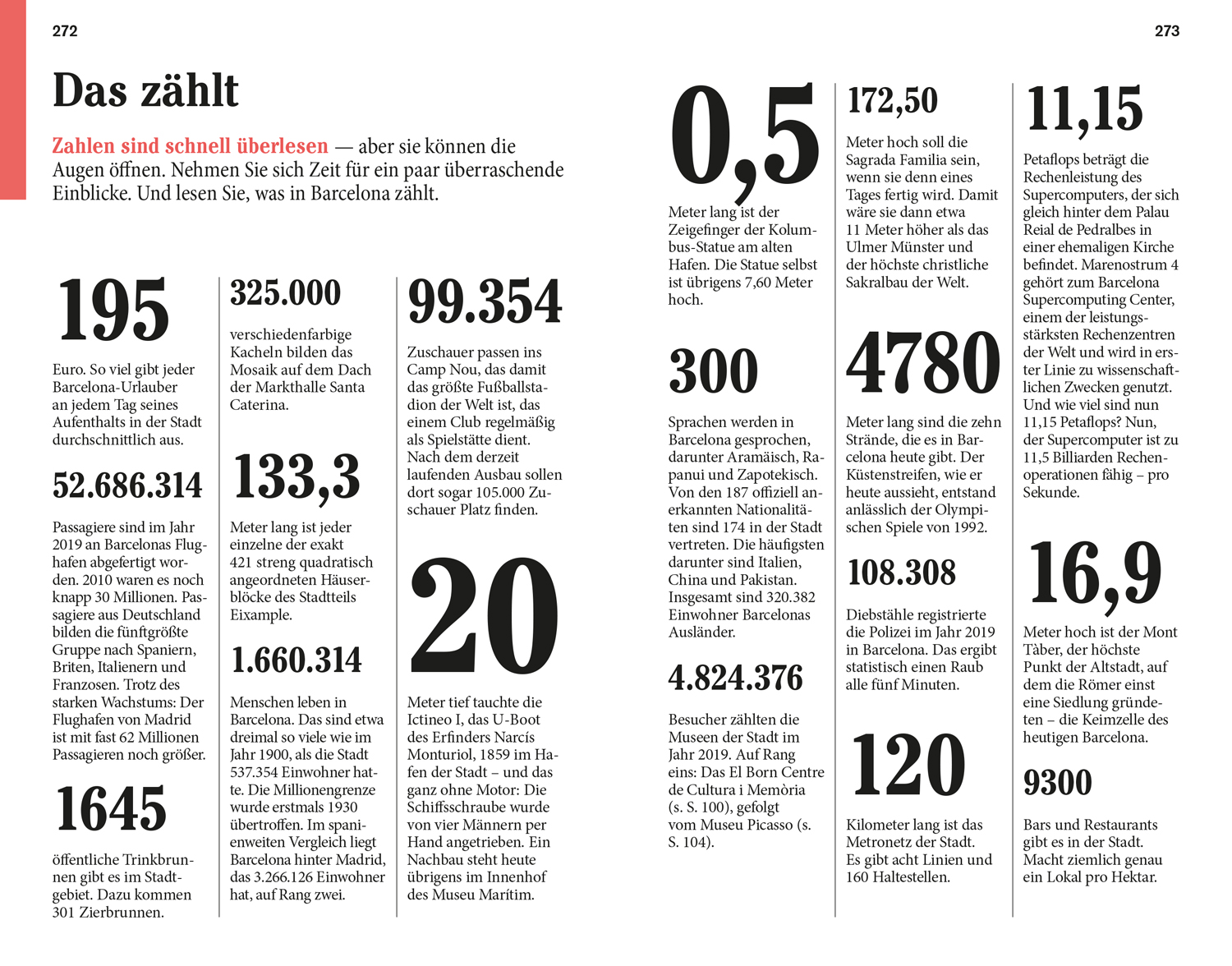 Senkrechtstarter, Überflieger, Kreuz & quer. Vor Ort - die Kapitel: Rambla und Barri Gòtic, El Raval, Sant Pere, Santa Caterina und La Ribera, Port Vell und Barceloneta, Montjuïc und Poble-sec, Poblenou, Eixample, Gràcia und Parc Güell, Außerhalb des Stadtzentrums. Das Kleingedruckte (Reiseinfos von A bis Z). Das Magazin. Offene Fragen.
