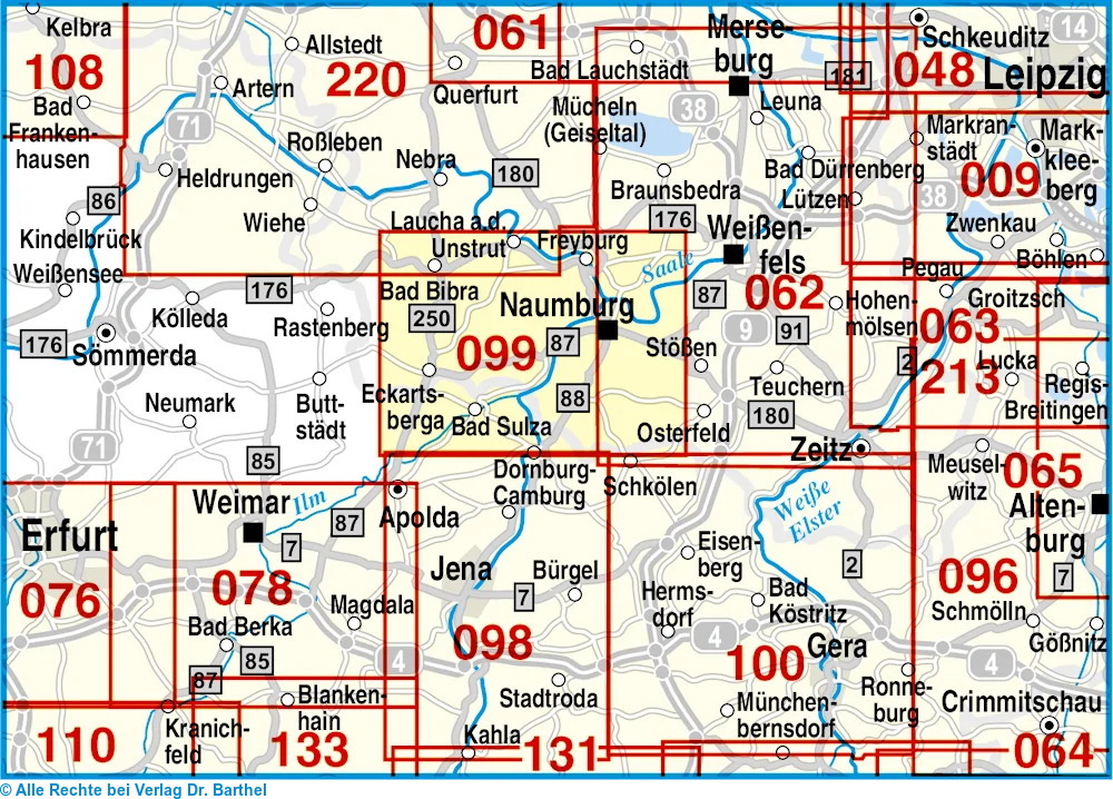 | Schlagworte | Bad Bibra • Bad Kösen • Biberbachradweg • Camburg • Eckartsberga • Freyburg /U. • Hasselbachradweg • Ilmtal-Radwanderweg • Laucha • Mühlenwanderweg • Naumburg • Naumburg/Saale (Umgebung), Karte; Radkarte • Naumburg/Saale (Umgebung), Karte; Wanderkarte • Naumburg/Saale (Umgebung); Radkarten • Naumburg/Saale (Umgebung); Wanderkarten • Saale, Karte; Radkarte • Saale, Karte; Wanderkarte • Saale; Radkarten • Saale-Radwanderweg • Saale; Wanderkarten • Unstrut-Radweg |
