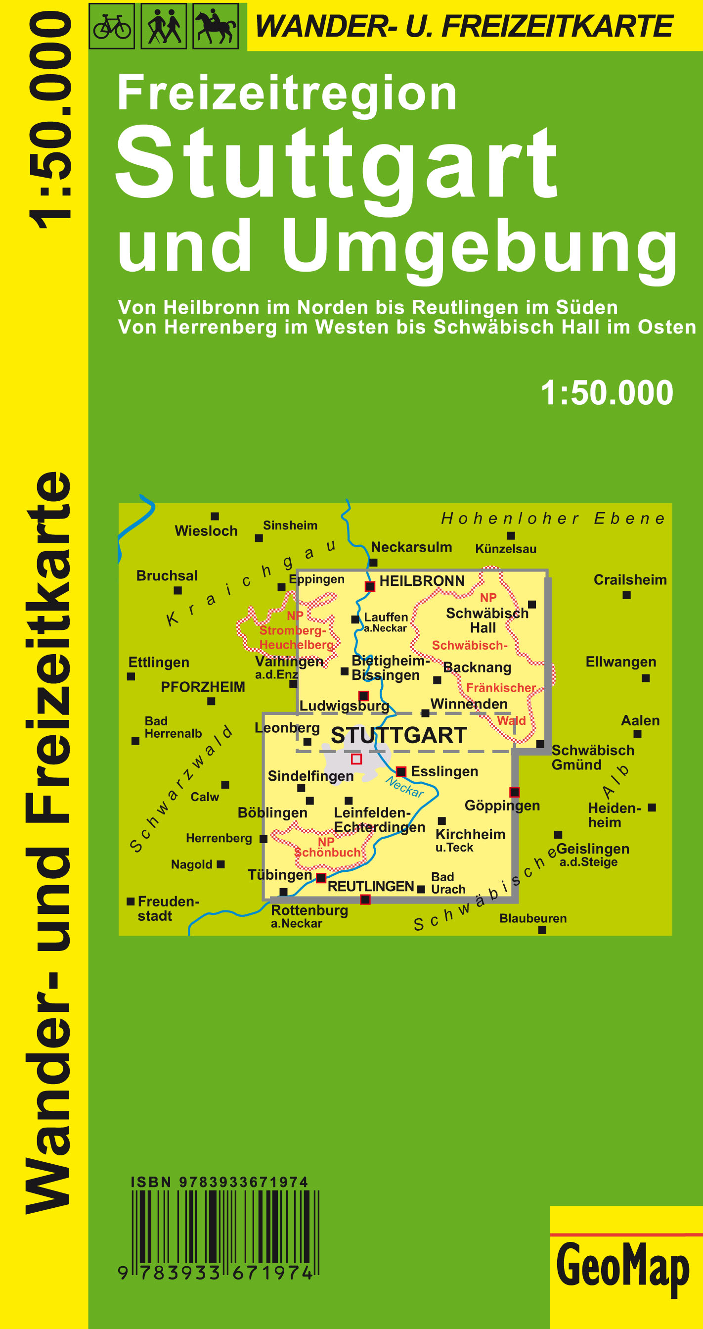 Wander- und Freizeitkarte Stuttgart und Umgebung 1:50.000. Von Heilbronn im Norden bis Reutlingen im Süden, von Herrenberg im Westen bis Schwäbisch Hall im Osten. Rad- und Wanderwege, Freizeiteinrichtungen, Sehenswürdigkeiten, Citypläne Stuttgart, Heilbronn, Ludwigsburg, Esslingen am Neckar, Göppingen, Reutlingen und Tübingen, Biergärten und Weinkellereien (Auswahl)