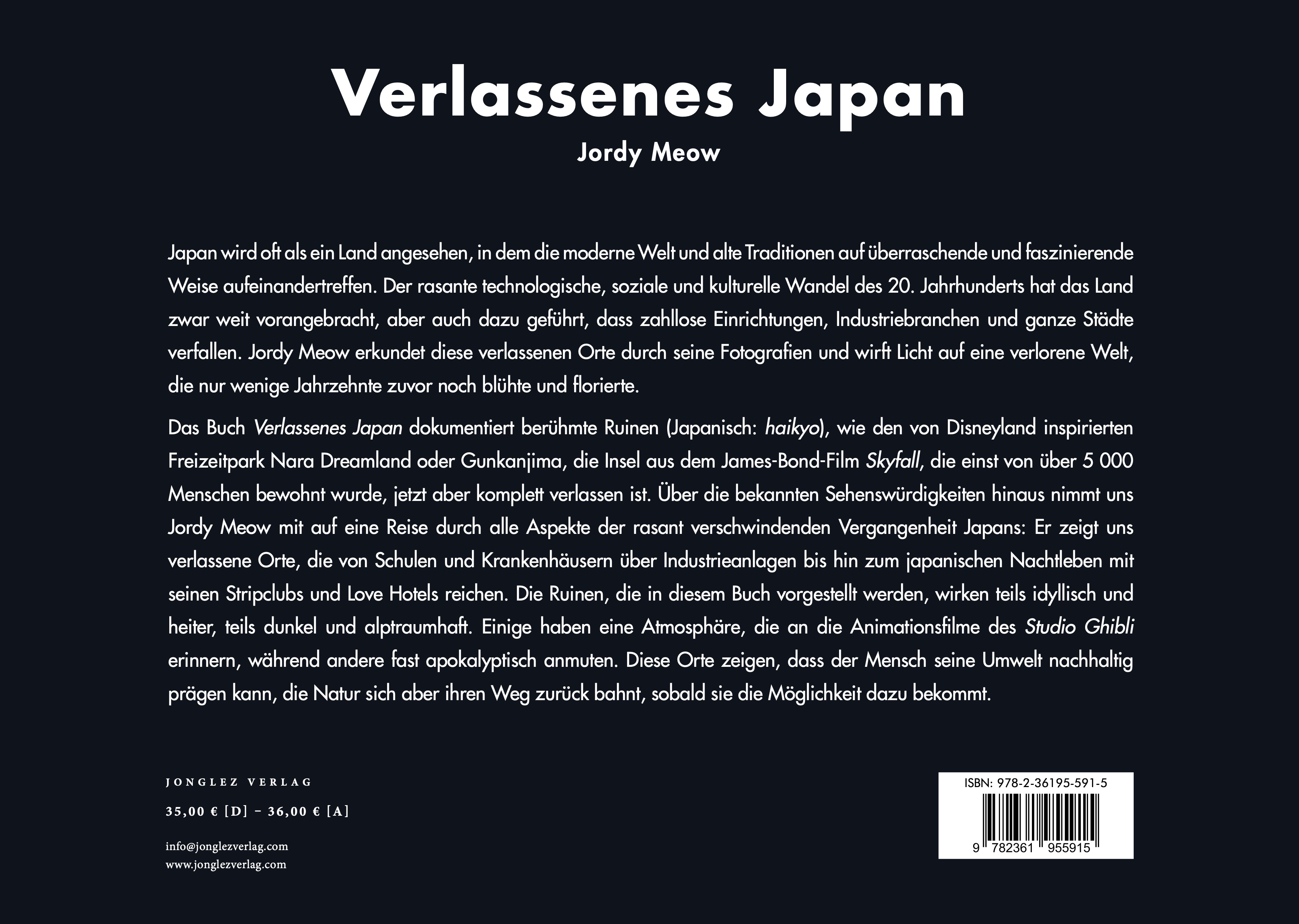 Jordy Meow hat diese vergessenen Orte besucht und führt uns mit seinen Aufnahmen in eine verlorene Welt, die vor nicht allzu langer Zeit noch im Aufschwung begriffen war. Abandoned Japan stellt damit eine wertvolle Quelle von Bildern dieser aufgegebenen (auf Japanisch haikyo genannten) Orte dar. Man sieht die durch den James-Bond-Film Skyfall berühmt gewordene, heute verlassene Insel Gunkanjima, auf der einst 5000 Menschen lebten, oder den von Disneyland inspirierten Freizeitpark Nara Dreamland. Neben diesen spektakulären Orten richtet Jordy Meow den Blick jedoch auch auf die Aspekte einer schnell untergehenden Vergangenheit, auf Schulen, Krankenhäuser und Industrieanlagen oder auf das Nachtleben mit seinen Stripteaseclubs und alten Hotels.