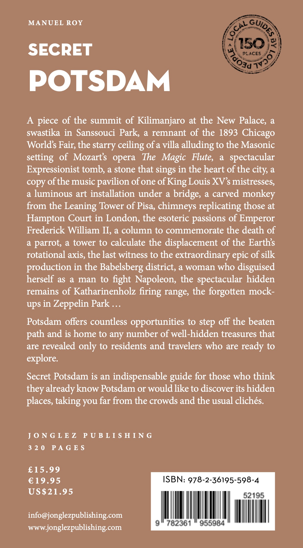 A piece of the summit of Kilimanjaro at the New Palace, a swasticak in Sanssouci Park, a remnant of the 1893 Chicago World's Fair, the starry ceiling of a villa alluding to the Masonic setting of Mozart's opera The Magic Flute, a spectacular Expressionist tomb, a stone that sings in the heart of the city, a copy of the music pavilion of one of King Louis XV's mistresses, a luminous art installation under a bridge, a carved monkey from the Leaning Tower of Pisa, chimneys replicating those at Hampton Court in London, the esoteric passions of Emperor Frederick William II, a column to commemorate the deat of a parrot, a tower to calculated the displacement of the Earth's rotational axis, the last witness to the extraordinary epic of silk production in the Babelsberg district, a woman who disguised herself as a man to fight Napoleon, the spectacular hidden remains of Katharinenholz firing range, the forgotten mock-ups in Zeppelin Park...