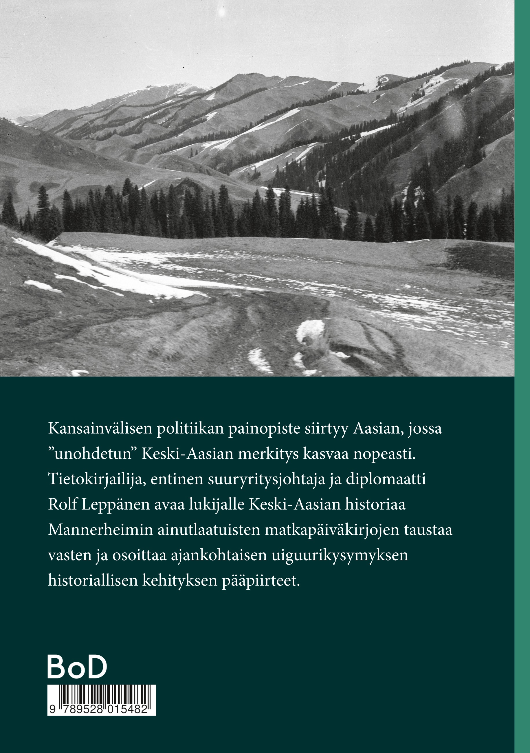 Kansainvälisen politiikan painopiste siirtyy Aasian, jossa ”unohdetun” Keski- Aasian merkitys kasvaa nopeasti. Tietokirjailija, entinen suuryritysjohtaja ja diplomaatti Rolf Leppänen avaa lukijalle Keski- Aasian historiaa Mannerheim ainutlaatuisten matkapäiväkirjojen taustaa vasten ja osoittaa ajankohtaisen uiguurikysymyksen historiallisen kehityksen pääpiirteet.