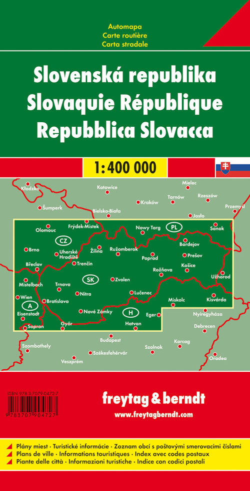 Mit der Straßenkarte Slowakische Republik im Maßstab 1:400.000 finden sich Urlauber die mit Auto, Motorrad oder Wohnwagen unterwegs sind bestens zurecht. Das weit verzweigte Straßennetz ist exakt abgebildet, Entfernungen und viele Ausflugsziele sind in der Karte eingezeichnet.