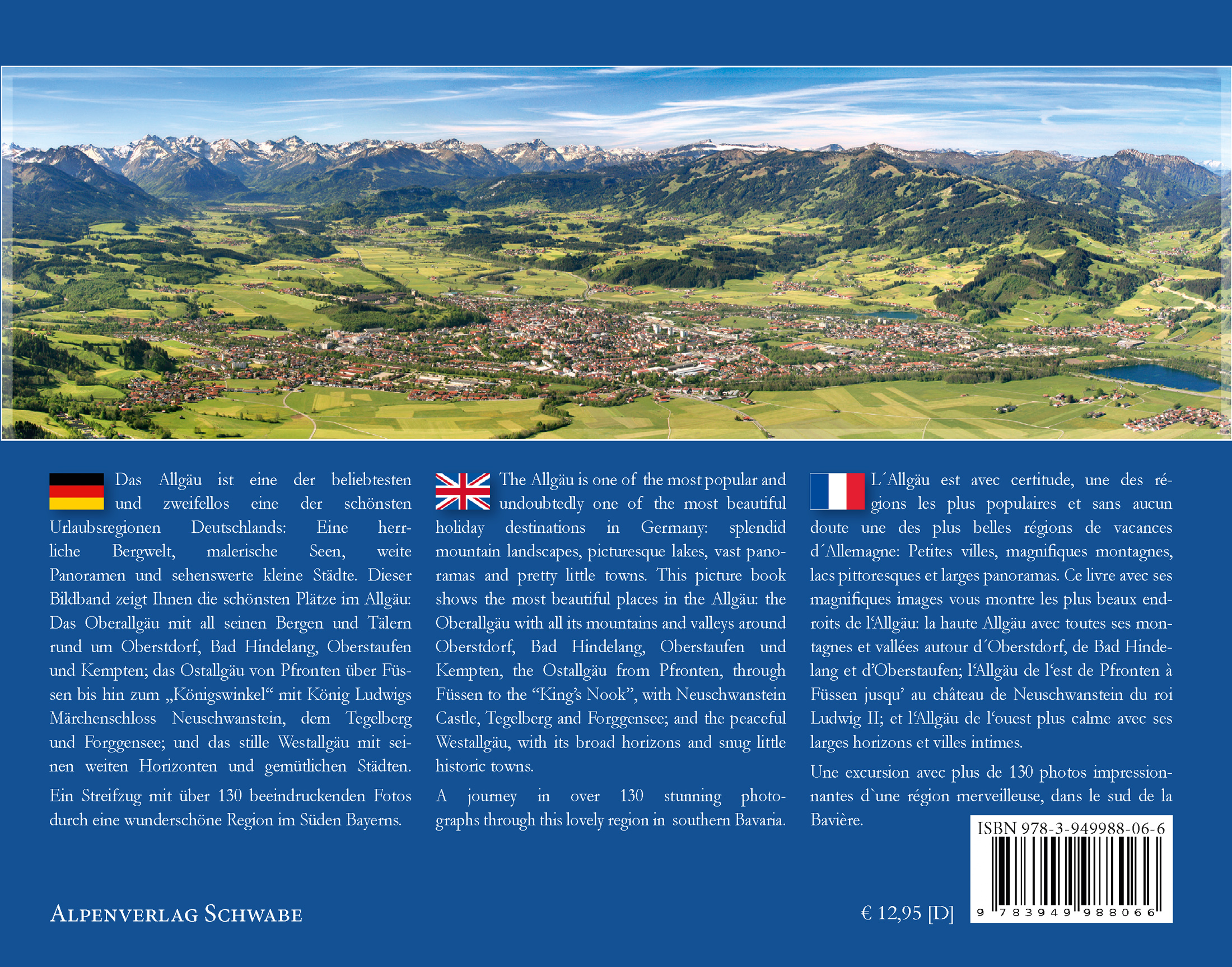 Dieser Bildband zeigt die schönsten Plätze im Allgäu: Das Oberallgäu mit seinen Bergen und Tälern rund um Oberstdorf, Bad Hindelang, Oberstaufen und Kempten: das Ostallgäu von Pfronten über Füssen bis hin zum "Königswinkel" mit König Ludwigs Märchenschloss Neuschwanstein, dem Tegelberg und Forggensee; un ddas stille Westallgäu mit seinen weiten Horizonten und gemütlichen Städten wie Wangen und Isny. Ein Streifzug mit über 130 beeindruckenden Fotos durch eine der schönsten Regionen Bayerns.