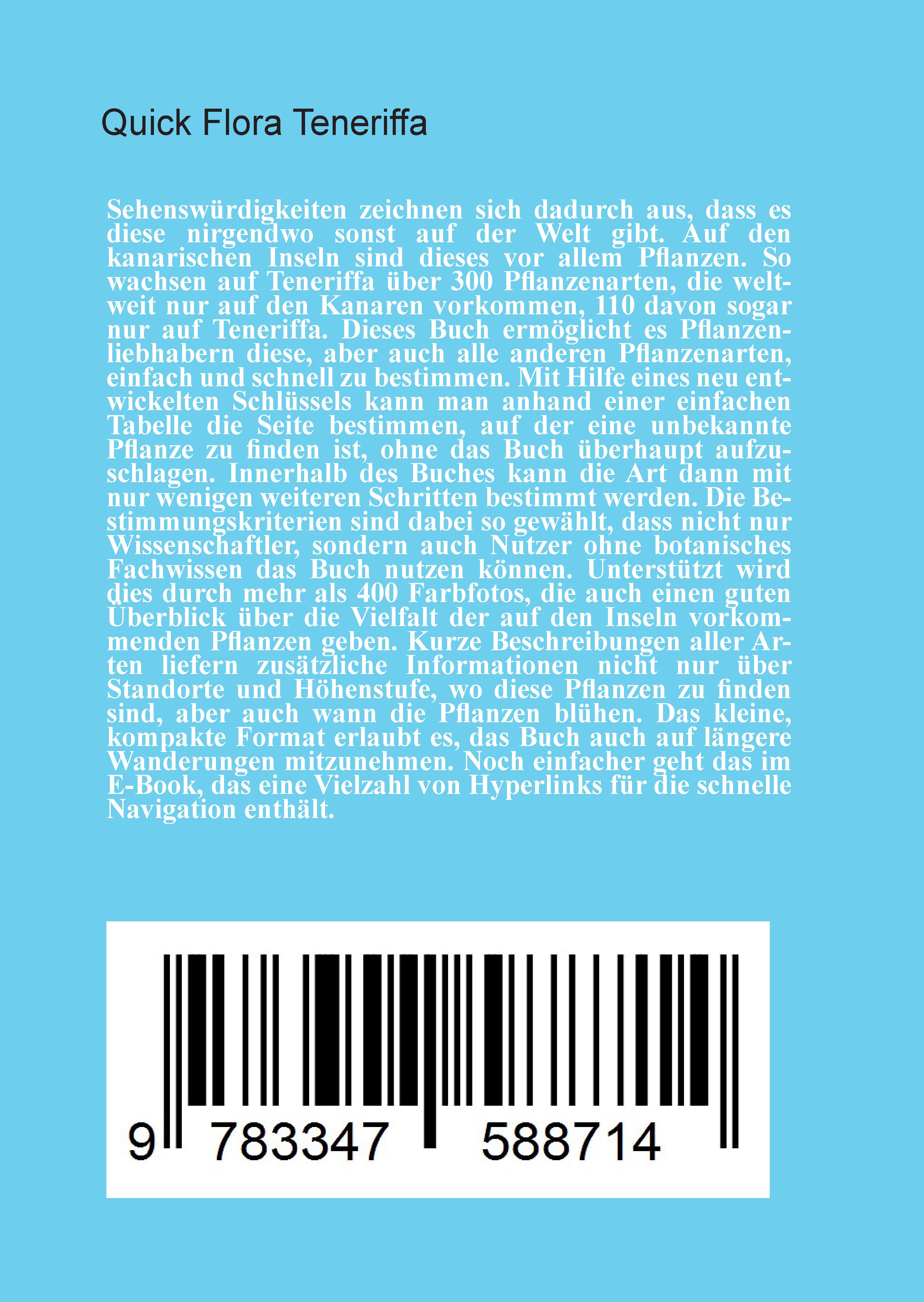 Sehenswürdigkeiten zeichnen sich dadurch aus, dass es diese nirgendwo sonst auf der Welt gibt. Auf den kanarischen Inseln sind dieses vor allem Pflanzen. So wachsen auf Teneriffa über 300 Pflanzenarten, die weltweit nur auf den kanarischen Inseln vorkommen, 110 davon sogar nur auf Teneriffa. Dieses Buch ermöglicht es Pflanzenliebhabern diese, aber auch alle anderen Pflanzenarten einfach und sicher zu bestimmen. Mit Hilfe eines neu entwickelten Schlüssels kann man anhand einer einfachen Tabelle die Seite bestimmen, auf der eine unbekannte Pflanze zu finden ist, ohne das Buch überhaupt aufzuschlagen. Innerhalb des Buches kann die Art dann mit nur wenigen weiteren Schritten bestimmt werden. Die Bestimmungskriterien sind dabei so gewählt, dass nicht nur Wissenschaftler, sondern auch Nutzer ohne botanisches Fachwissen das Buch nutzen können. Unterstützt wird dies durch mehr als 400 Farbfotos, die auch einen guten Überblick über die Vielfalt der auf den Inseln vorkommenden Pflanzen geben. Kurze Beschreibungen aller Arten liefern zusätzliche Informationen nicht nur über Standorte und Höhenstufe, wo diese Pflanzen zu finden sind, aber auch wann die Pflanzen blühen. Das kleine, kompakte Format erlaubt es, das Buch auch auf längere Wanderungen mitzunehmen. Noch einfacher geht das im E-Book, das eine Vielzahl von Hyperlinks für die schnelle Navigation enthält.