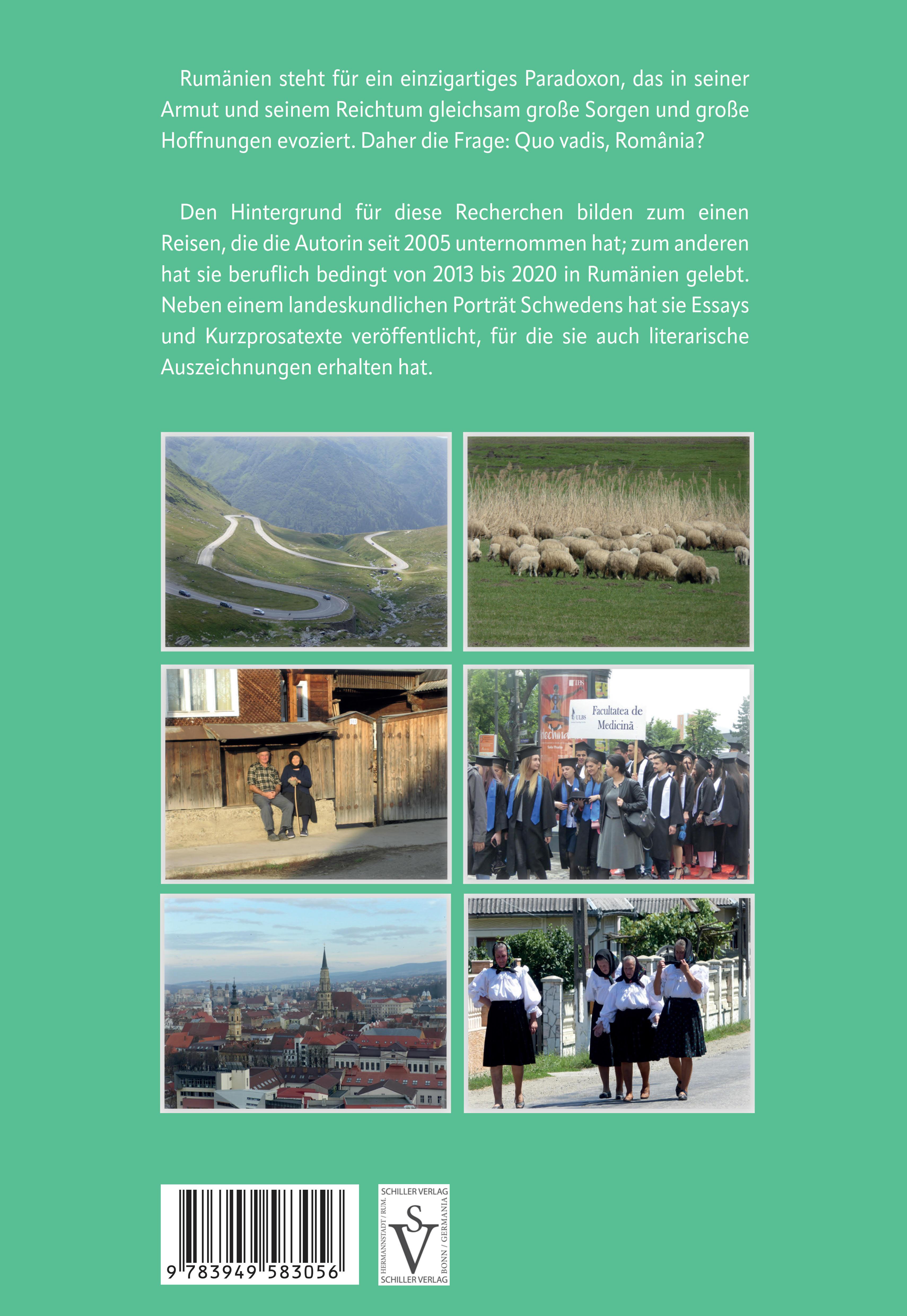 Rumänien steht für ein einzigartiges Paradoxon, das in seiner Armut und seinem Reichtum gleichsam große Sorgen und große Hoffnungen evoziert. Daher die Frage: Quo vadis, România? Den Hintergrund für diese Recherchen bilden zum einen Reisen, die die Autorin seit 2005 unternommen hat; zum anderen hat sie beruflich bedingt von 2013 bis 2020 in Rumänien gelebt. Neben einem landeskundlichen Porträt Schwedens hat sie Essays und Kurzprosatexte veröffentlicht, für die sie auch literarische Auszeichnungen erhalten hat.