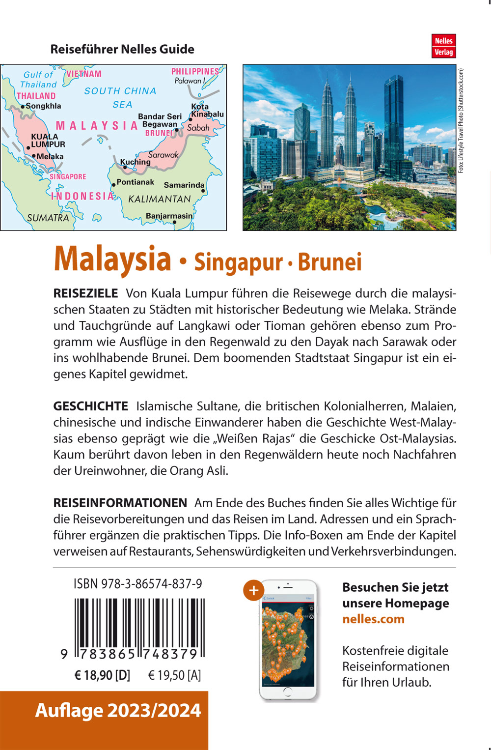 REISEZIELE: Von Kuala Lumpur führen die Reisewege durch die malaysischen Staaten zu Städten mit historischer Bedeutung wie Melaka. Strände und Tauchgründe auf Langkawi oder Tioman gehören ebenso zum Programm wie Ausflüge in den Regenwald zu den Dayak nach Sarawak oder ins wohlhabende Brunei. Dem boomenden Stadtstaat Singapur ist ein eigenes Kapitel gewidmet.