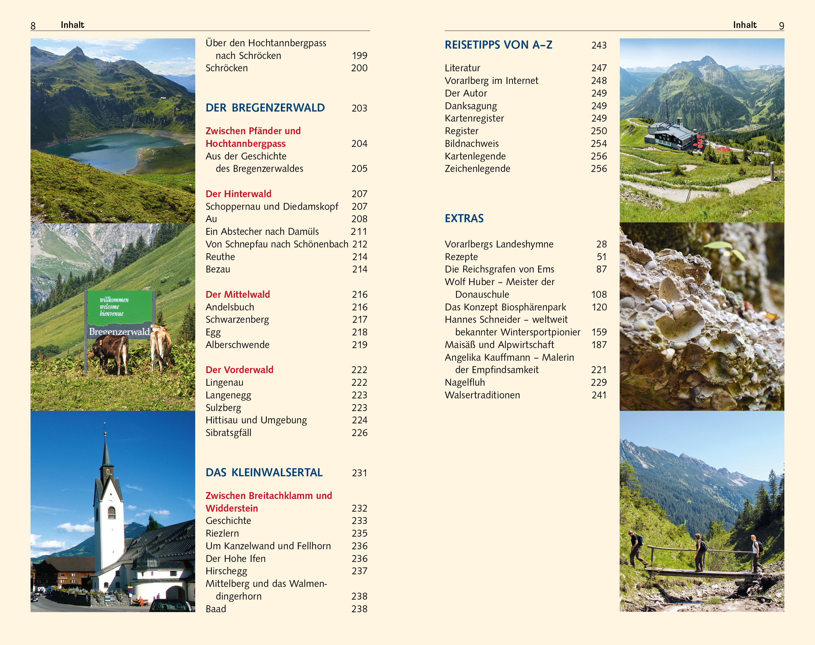 Vorwort 11Das Wichtigste in Kürze 12Unterwegs mit Kindern 15Herausragende Sehenswürdigkeiten 16LAND_ UND_ LEUTE 19Zahlen und Fakten 20Geographie und Bevölkerung 21Berge und Täler 21Geologie 22Gewässer und Klima 24Tier- und Pflanzenwelt 25Bevölkerung und Sprache 26Geschichte Vorarlbergs 29Von der Steinzeit bis zur Landnahme durch die Alemannen 29Das Mittelalter 31Die Neuzeit 35Vom Zeitalter Napoleons bis zum Ersten Weltkrieg 36Das 20. Jahrhundert 39Die Fußachaffäre 41Politik, Wirtschaft und Kultur 43Wirtschaft 44Literatur 45Bildende Kunst und Architektur 46Die moderne Holzbauweise 48Essen und Trinken 49AN _BODENSEE _UND _RHEIN 53Bregenz und Umgebung 54Stadtgeschichte 54Ein Stadtrundgang 57Sehenswürdigkeiten außerhalb der Altstadt 65Auf dem Pfänder 66Hard 70Vorarlbergs äußerster Norden 71Dornbirn und Umgebung 73Aus der Stadtgeschichte 73Sehenswürdigkeiten 74Dornbirns nähere Umgebung 76Hohenems 81Stadtgeschichte 81Sehenswürdigkeiten 83Die Schubertiade Hohenems 85Um Götzis und Rankweil 89Götzis 89Das Laternsertal 91Rankweil 93Feldkirch 96Stadtgeschichte 96Ein Stadtrundgang 98Sehenswertes außerhalb der Innenstadt 105Der Walgau 109Frastanz 109Nenzing und das Gamperdonatal 111Schlins und Umgebung 114DAS GROSSE _WALSERTAL 117Der Biosphärenpark Großes Walsertal 118Thüringen und Ludesch 121St. Gerold 121Blons 123Sonntag 125An der Straße zum Faschinajoch 127Buchboden und Gadental 128Raggal und das Marultal 130BLUDENZ _UND_ SEINE_ TÄLER 135Bludenz 136Stadtgeschichte 136Das Stadtzentrum 138Sehenswürdigkeiten außerhalb des Zentrums 141Der Muttersberg 142Das Brandnertal 145Bürs 145Bürserberg 145Brand 147Der Lünersee 148Das Klostertal 152Innerbraz 153Dalaas 153Wald am Arlberg 154Klösterle 156Stuben 157DAS_ MONTAFON 161Touristik und Veranstaltungen 163Lorüns und St. Anton 164Vandans und das Rellstal 165Bartholomäberg und Umgebung 167Schruns 169Das Silbertal 172Tschagguns und Umgebung 174Im Gargellental 176St. Gallenkirch 178Gaschurn und Umgebung 178Das Garneratal 180Partenen 181Die Silvretta-Hochalpenstraße 182Um Lech und Zürs 189Wintersportzentrum der Extraklasse 190Die Flexenstraße und der Flexenpass 190Zürs 192Lech am Arlberg 192Am oberen Lech 196Tannberg 198Warth 199Über den Hochtannbergpass nach Schröcken 199Schröcken 200DER _BREGENZERWALD 203Zwischen Pfänder und Hochtannbergpass 204Aus der Geschichte des Bregenzerwaldes 205Der Hinterwald 207Schoppernau und Diedamskopf 207Au 208Ein Abstecher nach Damüls 211Von Schnepfau nach Schönenbach 212Reuthe 214Bezau 214Der Mittelwald 216Andelsbuch 216Schwarzenberg 217Egg 218Alberschwende 219Der Vorderwald 222Lingenau 222Langenegg 223Sulzberg 223Hittisau und Umgebung 224Sibratsgfäll 226Das_ Kleinwalsertal 231Zwischen Breitachklamm und Widderstein 232Geschichte 233Riezlern 235Um Kanzelwand und Fellhorn 236Der Hohe Ifen 236Hirschegg 237Mittelberg und das Walmendingerhorn 238Baad 238REISETIPPS VON A-Z 243Literatur 247Vorarlberg im Internet 248Der Autor 249Danksagung 249Kartenregister 249Register 250Bildnachweis 254Kartenlegende 256Zeichenlegende 256EXTRASVorarlbergs Landeshymne 28Rezepte 51Die Reichsgrafen von Ems 87Wolf Huber - Meister der Donauschule 108Das Konzept Biosphärenpark 120Hannes Schneider - weltweit bekannter Wintersportpionier