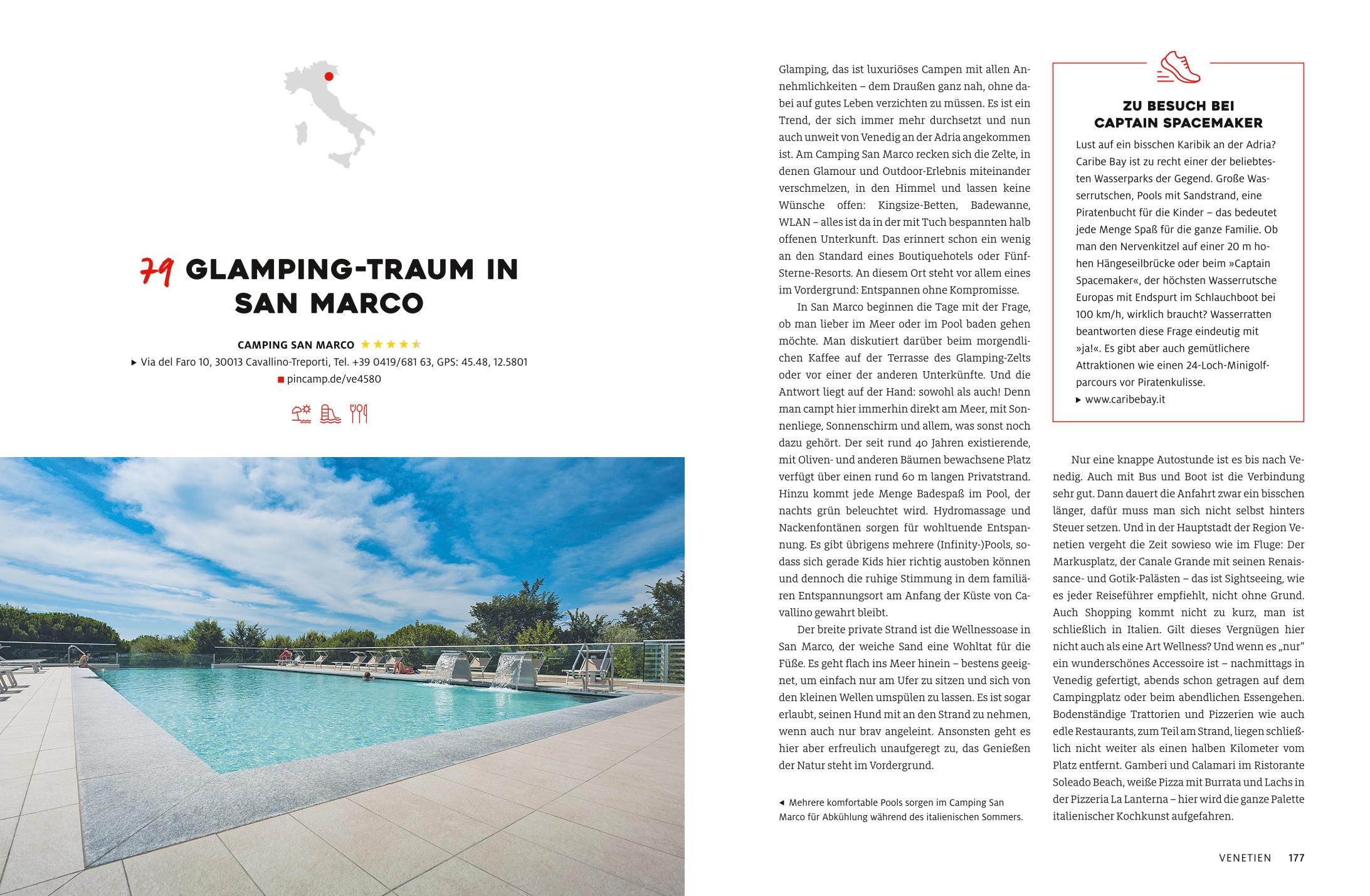 Endlich ausspannen! Wellness mit Blick auf die Berge. Der herrliche Pool direkt am Platz, die Sauna im Grünen mit Blick auf den See. Auf diesen Plätzen wird Wohlfühlen ganz groß geschrieben. Übernachtet wird bequem im eigenen Camper – oder ausnahmsweise doch lieber im luxuriösen Baumhaus? Denn auch das gibt es auf den Plätzen, die dieser Band vorstellt immer wieder: luxuriös schlafen in ausgefallenen Mietunterkünfte mit Blick direkt in den Sternenhimmel. Und weil zum Ausspannen noch viel mehr gehört, stellt der Band auch zahlreiche Wohlfühl-Erfahrungen in der nahen Umgebung vor – vom Waldbaden über Yoga auf dem Berggipfel bis zur Achtsamkeitswanderung am Meeresstrand. Mit Plätzen in Deutschland, Österreich, der Schweiz und Oberitalien - von der Nordsee bis ans Mittelmeer. In Zusammenarbeit mit PiNCAMP, dem Camping-Portal des ADAC.