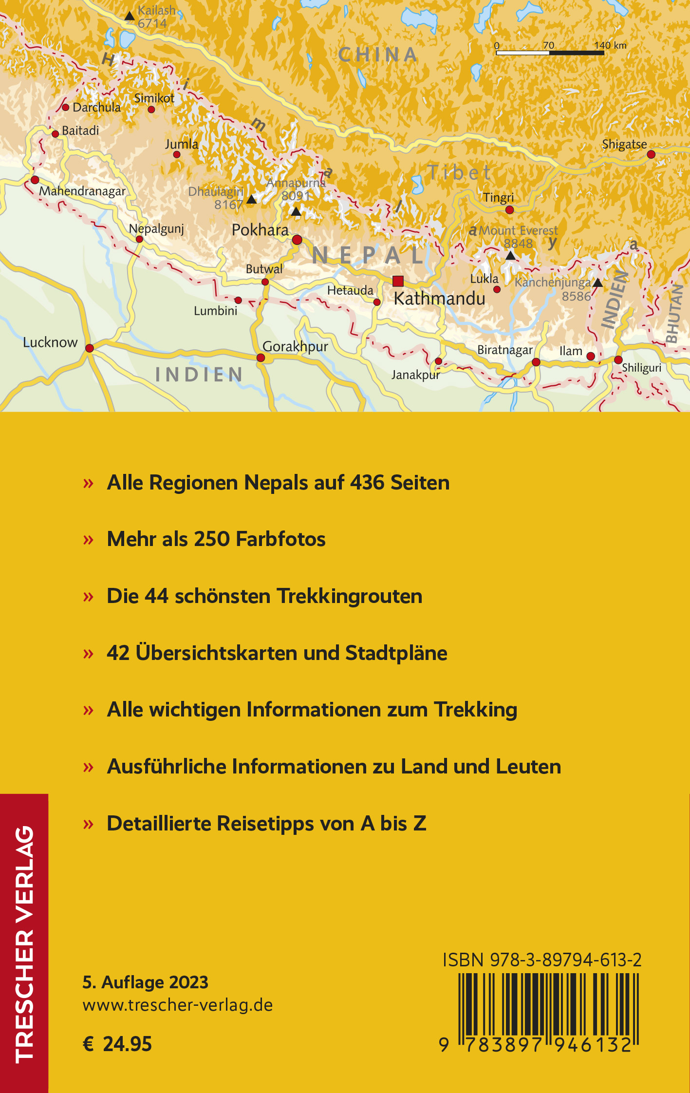 Liebe Leserinnen und Leser,Nepal ist ein Land zwischen Regen-Urwäldern und Bergwüsten, von den tropisch heißen Regionen im Terai bis zu den eisigen Spitzen des Himalaya. Diese Umwelt gehört allen Menschen, und es ist deshalb unser aller Verantwortung, sie zu beschützen. Es ist ein Land, bestehend aus weit mehr als 60 verschiedenen Völkern, ein Land uralter Kulturen, ein religiöses Land zwischen Tradition und Moderne, ein Land im Aufbruch und im Wandel. Es ist wichtig, diese Kulturen, Traditionen und Religionen zu erhalten. Nepal erwartet Sie.Ich freue mich, dass der Autor Ihnen mein Heimatland in einem interessanten und sachlichen, dennoch spannend zu lesenden Querschnitt vorstellt. Nicht nur die »Höhepunkte» wie Annapurna, Mount Everest, Kathmandu und Pokhara werden beschrieben, sondern auch unbekannte und weniger erschlossene Gebiete vorgestellt - Regionen, in denen Sie eine noch fast unverfälschte traditionelle Lebensart vorfinden können. Vor allem in diesen Gegenden erleben Sie die geduldige, in ihre Religion eingebettete Lebensweise, die den Menschen im Himalaya eigen ist. Ob im fernen Westen, im äußersten Osten oder auch in meiner Heimat, dem Dolpo.Als spirituelle Leitfigur ist es meine Aufgabe, die buddhistischen Traditionen zu schützen und zu bewahren, aber als normaler Mensch auch Kontakte zur Moderne - zum Wohl der Menschen - herzustellen. Wir alle stehen in der Verantwortung, einen friedlichen und humanen Umgang miteinander zu pflegen und alles in unseren Kräften Stehende dafür zu tun, dass Frieden und Menschlichkeit auch weiterhin eine Grundlage und eine Zukunft in unserer Welt haben.In diesem Sinne: Herzlich willkommen im Dolpo - herzlich willkommen in Nepal!(Von Dolpo Tulku Rinpoche, geistlicher Führer im Dolpo)---------------------------------------------------Liebe Leserinnen und Leser,unsere Welt ist im Wandel, und gerade in Nepal ändern sich die Dinge in einem teilweise so atemberaubenden Tempo, dass man kaum mitkommt. Die Wiederaufbauarbeiten nach dem Erdbeben von 2015 sind so gut wie überall abgeschlossen. Der Streit um die neuen Provinzen mit der Volksgruppe der Madeshi im Süden des Landes ist beigelegt. Die verschiedenen Regierungen schlittern nach den beiden ruhigen Jahren 2018 und 2019 von einer Krise in die andere. Die beiden Coronawellen in den Jahren 2020 und 2021 haben dem Land sehr arg zugesetzt - es waren nicht nur viele Opfer zu beklagen, auch der Tourismus kam völlig zum Erliegen. Viele Menschen, die im Tourismus arbeiteten, sind weggegangen, und etliche Unterkünfte auf den Trekkingrouten bleiben wohl noch für eine ganze Weile geschlossen. Dafür ist in den letzten drei Jahren eine schier unglaubliche Zahl an neuen Straßen entstanden. Ich habe versucht, alle Änderungen, die das Reisen in Nepal betreffen, in diese Neuauflage einzuarbeiten. Einen Anspruch auf Vollständigkeit kann und will ich allerdings nicht erheben. Der Verlag und der Autor bedanken sich für die bisher eingegangenen Hinweise und die sachliche Kritik zum Buch ebenso wie für das dafür ausgesprochene Lob. (Ray Hartung, Dresden, Kathmandu und Berlin, im Januar 2023)>>> Weitere Reiseführer zu Ländern des Himalaya und zu Reisezielen in Asien finden Sie auf der Website des Trescher Verlags.