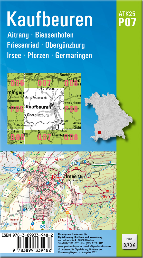 Wer es genau wissen will, greift zur ATK25. Diese Kartenserie im Maßstab 1:25000 bildet mit ihrer detaillierten Darstellung das komplette Verkehrsnetz mit allen Straßen und Wegen ab.237 Einzelblätter stellen Bayern flächendeckend dar. Ein Kartenblatt umfasst ca. 21 km x 22 km.Was bietet die ATK25?- individuelle Freizeitgestaltung mit allen ausgeschilderten Wander- und Radwanderwegen- sichere Orientierung auch abseits der markierten Routen- umfangreiches Spektrum an Freizeiteinrichtungen und Sehenswürdigkeiten- anschauliche Wiedergabe der GeländeformenKartenblatt ATK25-P07 Kaufbeuren:REGION: Schwaben, AllgäuORTE: Kaufbeuren, Aitrang, Biessenhofen, Friesenried, Obergünzburg, Irsee, Pforzen, Germaringen, Rieden, Baisweil, Unteregg