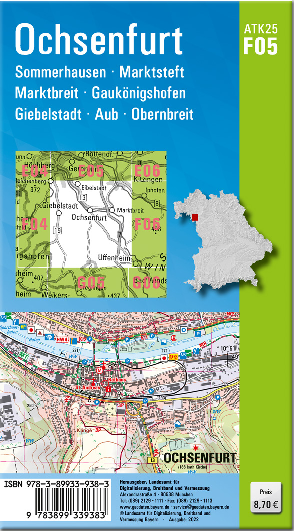 Wer es genau wissen will, greift zur ATK25. Diese Kartenserie im Maßstab 1:25000 bildet mit ihrer detaillierten Darstellung das komplette Verkehrsnetz mit allen Straßen und Wegen ab.237 Einzelblätter stellen Bayern flächendeckend dar. Ein Kartenblatt umfasst ca. 21 km x 22 km.Was bietet die ATK25?- individuelle Freizeitgestaltung mit allen ausgeschilderten Wander- und Radwanderwegen- sichere Orientierung auch abseits der markierten Routen- umfangreiches Spektrum an Freizeiteinrichtungen und Sehenswürdigkeiten- anschauliche Wiedergabe der GeländeformenKartenblatt ATK25-F05 Ochsenfurt:REGION: Unterfranken, Mittelfranken, Ochsenfurter GauORTE: Ochsenfurt, Sommerhausen, Marktsteft, Marktbreit, Gaukönigshofen, Giebelstadt, Aub, Obernbreit, Winterhausen, Martinsheim