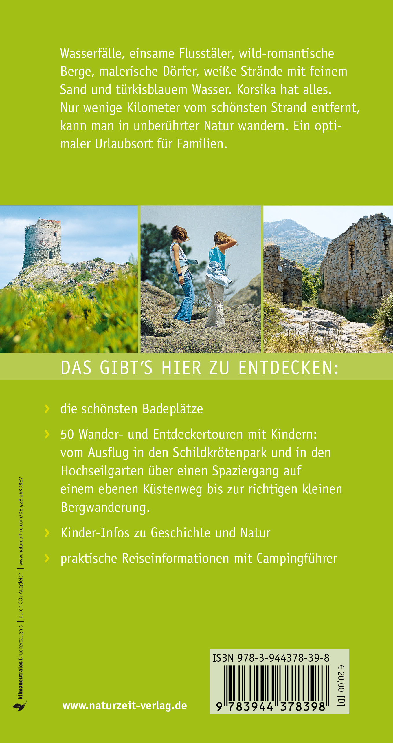 Korsika mit Kindern - Wasserfälle, einsame Flußtäler, wild-romantische Berge, malerische Dörfer, weiße Strände mit feinem Sand und türkisblauem Wasser. Korsika hat alles. Nur wenige Kilometer vom schönsten Strand entfernt, kann man in unberührter Natur wandern. Ein optimaler Urlaubsort für Familien.Das Buch enthält 50 Tourenvorschläge für Familien: vom Besuch im Schildkrötenpark oder im Hochseilgarten über einfache kurze Küstenwanderungen bis zur richtigen kleinen Bergtour. Auch ein Ausflug mit dem Kanu und eine Wanderung mit Esel sind dabei. Alle Touren sind sorgfältig beschrieben und mit detaillierter Karte, Höhenprofil und vielen stimmungsvollen Fotos ergänzt.Zusätzliche Informationen über Natur, Geschichte und Kultur der Insel helfen Eltern, Kinderfragen zu beantworten oder interessante Geschichten zu erzählen. Das Buch enthält neben den Wanderungen auch die schönsten Strände und viele weitere Ausflugsziele für Familien, sowie einen detaillierten Campingführer und viele praktische Reisetipps.