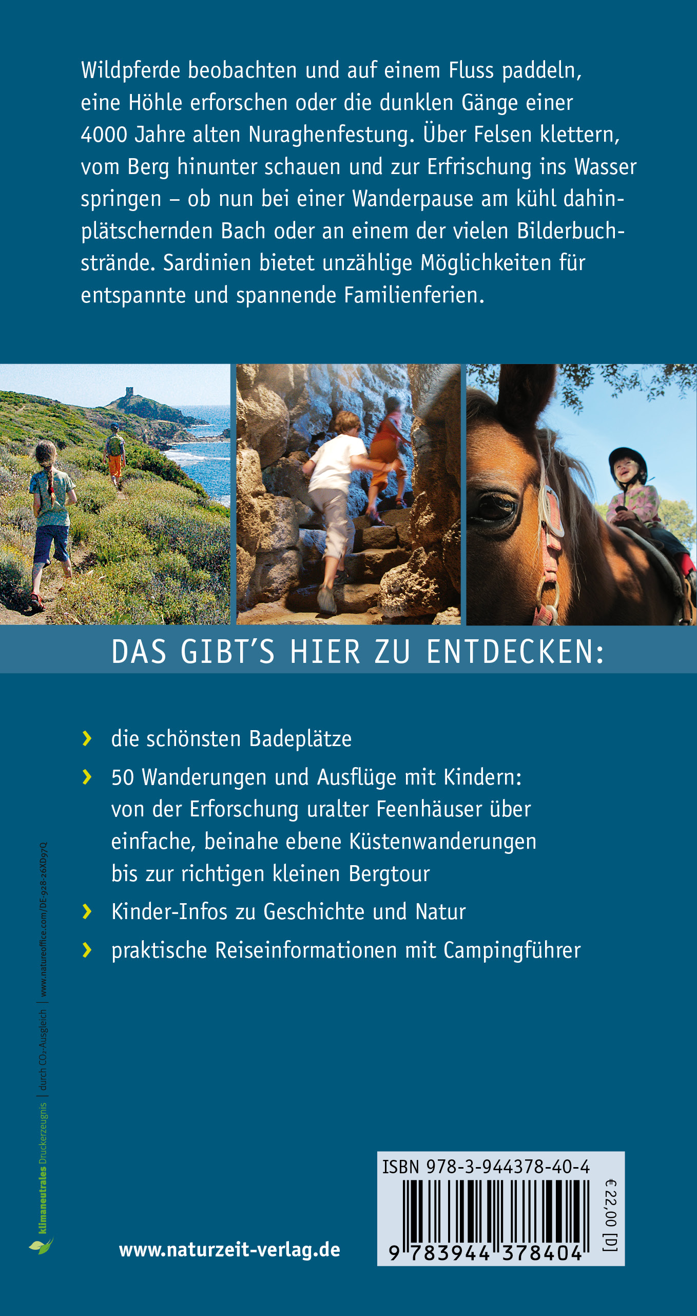 Wildpferde beobachten und auf dem Fluss paddeln, eine Höhle erforschen oder die dunklen Gänge einer 4000 Jahre alten Nuraghenfestung. Über Felsen klettern, vom Berg hinunter schauen und zur Erfrischung ins Wasser springen. Ob nun bei einer Wanderpause am kühl dahinplätschernden Bach oder aber am Meer an einem der vielen Bilderbuchstrände. Sardinien bietet eine Vielzahl an Möglichkeiten für entspannte und spannende Familienferien.Das Buch enthält 50 Tourenvorschläge für Familien von der Erforschung eines Nuraghen oder dem Besuch im Hochseilgarten über einfache kurze Küstenwanderungen bis zur richtigen kleinen Bergtour. Auch ein Ausflug mit dem Kanu und eine Fahrradtour sind dabei. Alle Touren sind sorgfältig beschrieben und mit detaillierter Karte, Höhenprofil und vielen stimmungsvollen Fotos ergänzt.Zusätzliche Informationen über Natur, Geschichte und Kultur der Insel helfen Eltern, Kinderfragen zu beantworten oder interessante Geschichten zu erzählen. Das Buch enthält neben den Wanderungen auch die schönsten Strände und viele weitere Ausflugsziele für Familien, sowie einen detaillierten Campingführer und viele praktische Reisetipps. Weitere Informationen und eine Leseprobe zum Buch finden Sie unter www.naturzeit-verlag.de.