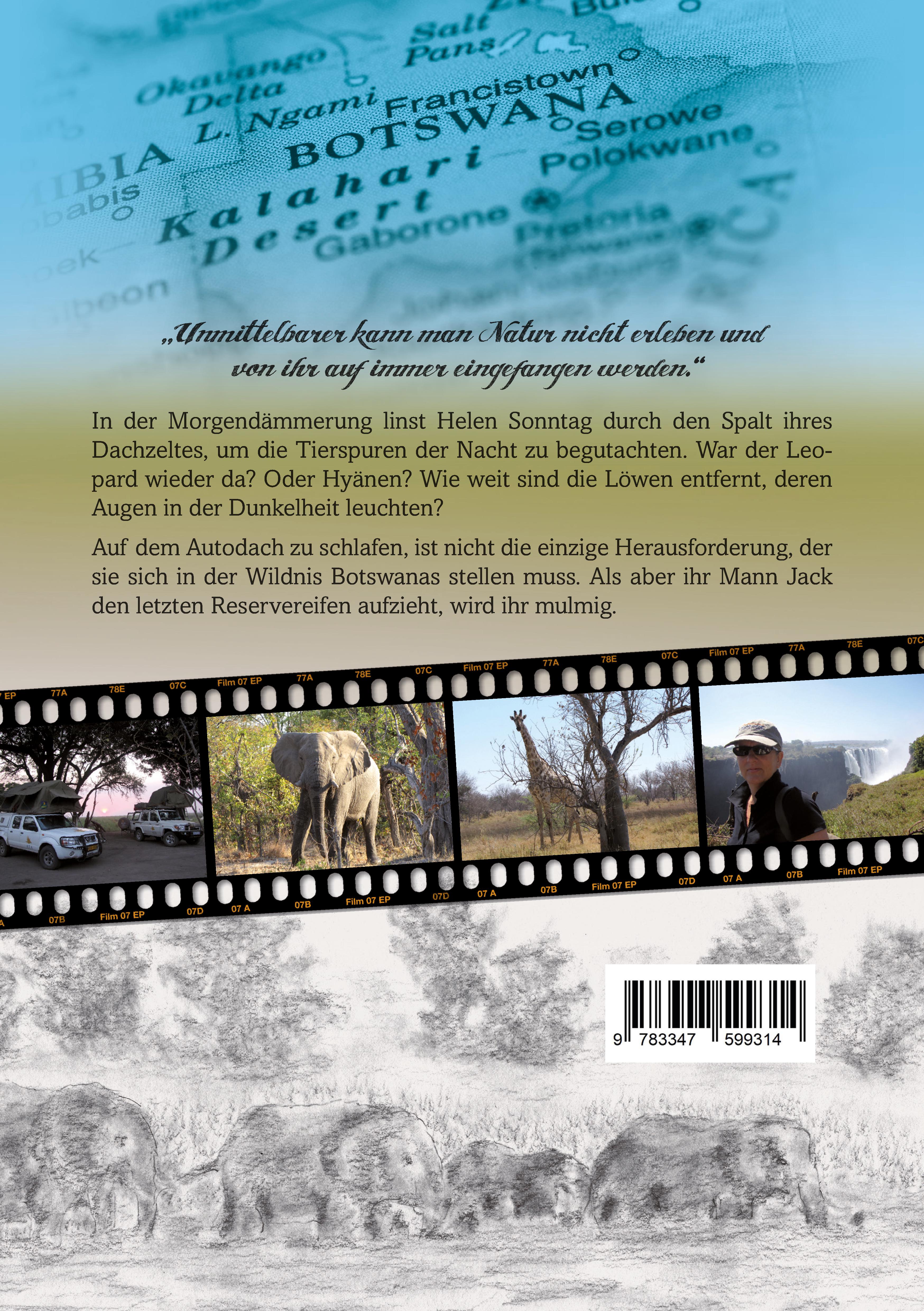 "Unmittelbarer kann man Natur nicht erleben und von ihr auf immer eingefangen werden."In der Morgendämmerung linst Helen Sonntag durch den Spalt ihres Dachzeltes, um die Tierspuren der Nacht zu begutachten. War der Leopard wieder da? Oder Hyänen? Wie weit sind die Löwen entfernt, deren Augen in der Dunkelheit leuchten? Auf dem Autodach zu schlafen, ist nicht die einzige Herausforderung, der sie sich in der Wildnis Botswanas stellen muss. Als aber ihr Mann Jack den letzten Reservereifen aufzieht, wird ihr mulmig