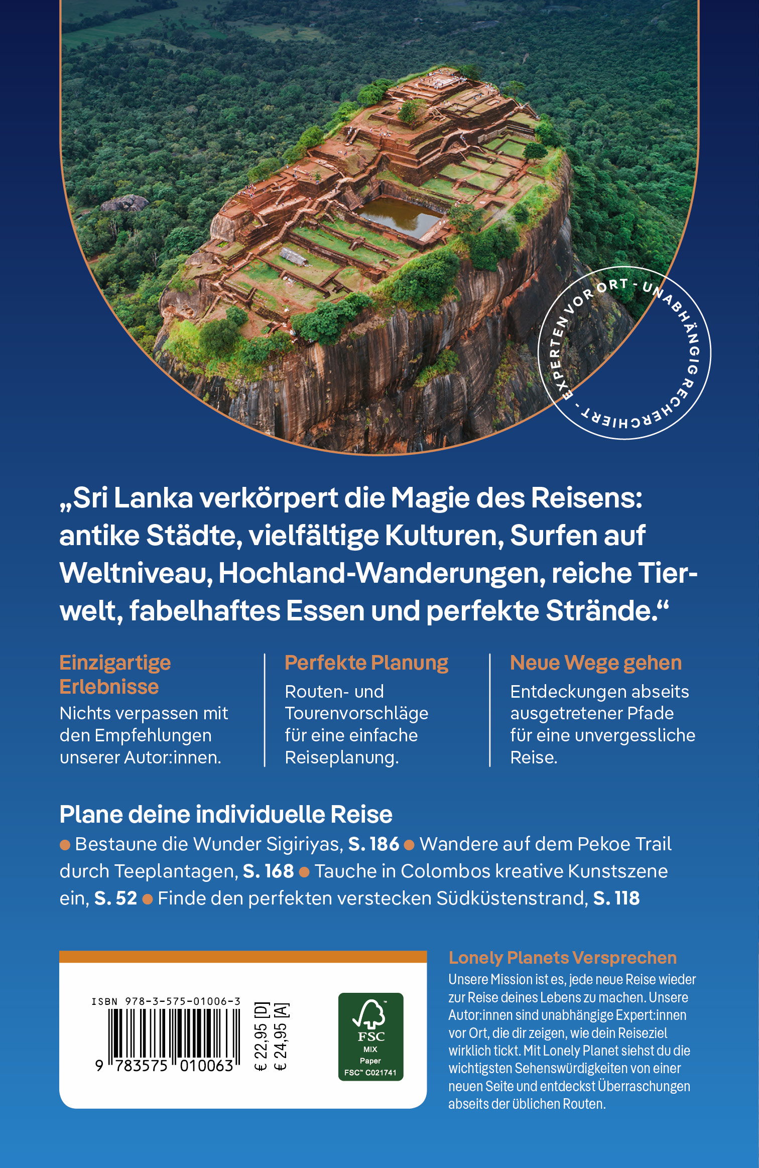 Mit dem Lonely Planet Sri Lanka auf eigene Faust durch ein unentdecktes Land mit alter Geschichte! Etliche Monate Recherche stecken im Kultreiseführer für Individualreisende. Die Autoren geben sachkundige Hintergrundinfos zum Reiseland, liefern Tipps und Infos für die Planung der Reise, beschreiben alle interessanten Sehenswürdigkeiten und präsentieren ihre persönlichen Entdeckungen und Tipps. Auch Globetrotter, die abseits der ausgetretenen Touristenpfade unterwegs sein möchten, kommen auf ihre Kosten. Wie wäre es beispielsweise mit einem märchenhaft gutem Essen? Mit dem Nationalgericht, einem Reiscurry, macht man nichts falsch. Familiengeführte Guesthouses kennen oft die besten Rezepte. Oder Naturparadiese entdecken? Der Lonely-Planet-Reiseführer Sri Lanka ist ehrlich und praktisch geschrieben und liefert inspirierende Eindrücke und Erfahrungen.
