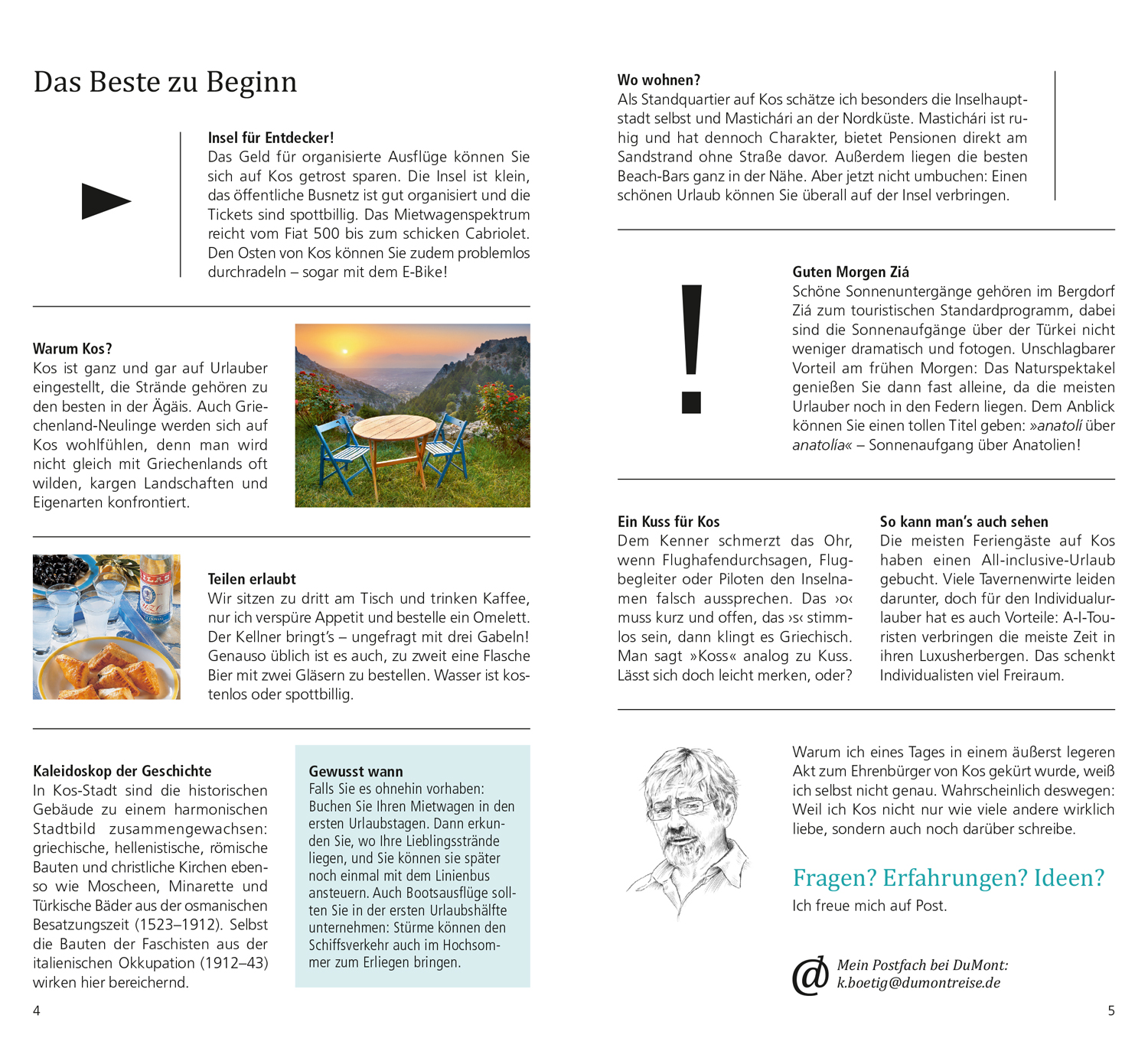 Dank vieler Tipps und Adressen erfahren Sie, wo es sich in fremden Betten gut schläft, wo Sie glücklich satt werden, wohin die Menschen auf Kos zum Stöbern und Entdecken gehen und wohin es sie zieht, wenn die Nacht beginnt.