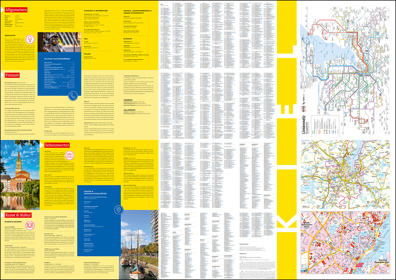 Auf der Rückseite findest du nicht nur Wissenswertes über Kiel, sondern auch ein Straßenverzeichnis mit Postleitzahlen und Suchfeldangaben, einen Innenstadtplan von Kiel sowie eine Durchfahrtskarte. Der Kieler Liniennetzplan hilft dir darüber hinaus bei der Planung deiner Fahrten mit dem öffentlichen Nahverkehr.
