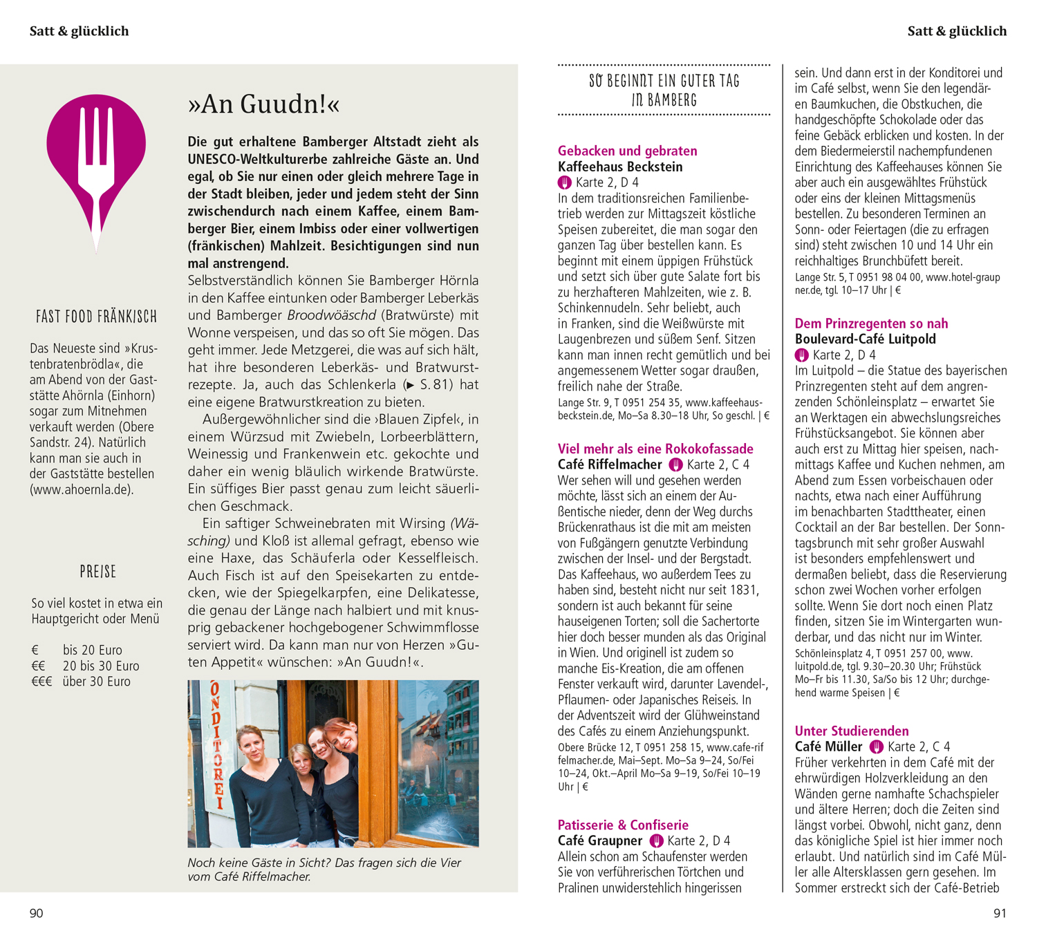 In eigenen Kapiteln erfahren Sie, wo es sich in fremden Betten gut schläft, wo Sie glücklich satt werden, wohin die Bamberger zum Stöbern und Entdecken gehen und wohin es sie zieht, wenn die Nacht beginnt.
