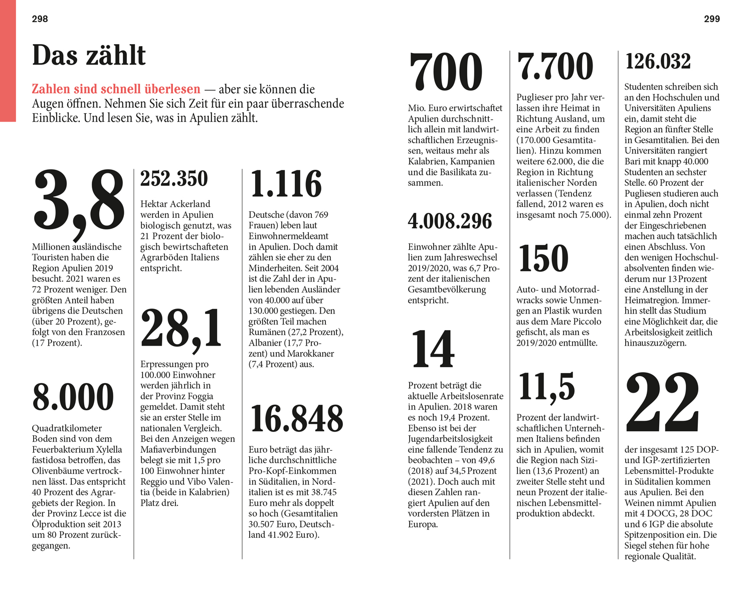 Senkrechtstarter, Überflieger, Querfeldein. Vor Ort - die Kapitel: Gargano und Isole Tremiti, Die alte Capitanata, Costa di Bari, Terra di Bari und Valle d'Itria, Taranto und die Murgia Tarantina, Provincia di Brindisi, Lecce und der Salento. Das Kleingedruckte (Reiseinfos von A bis Z). Das Magazin. Offene Fragen.