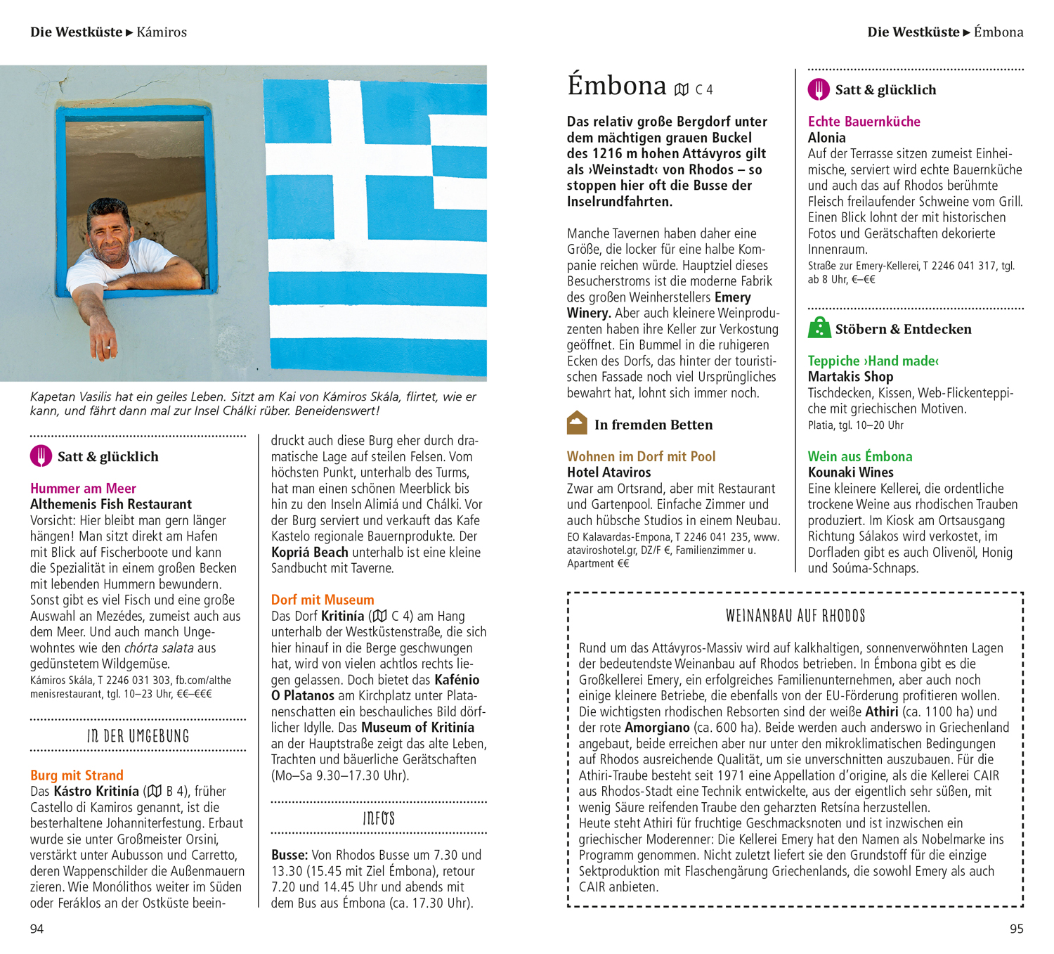 Dank vieler Tipps und Adressen erfahren Sie, wo es sich in fremden Betten gut schläft, wo Sie glücklich satt werden, wohin die Menschen auf Rhodos zum Stöbern und Entdecken gehen und wohin es sie zieht, wenn die Nacht beginnt.
