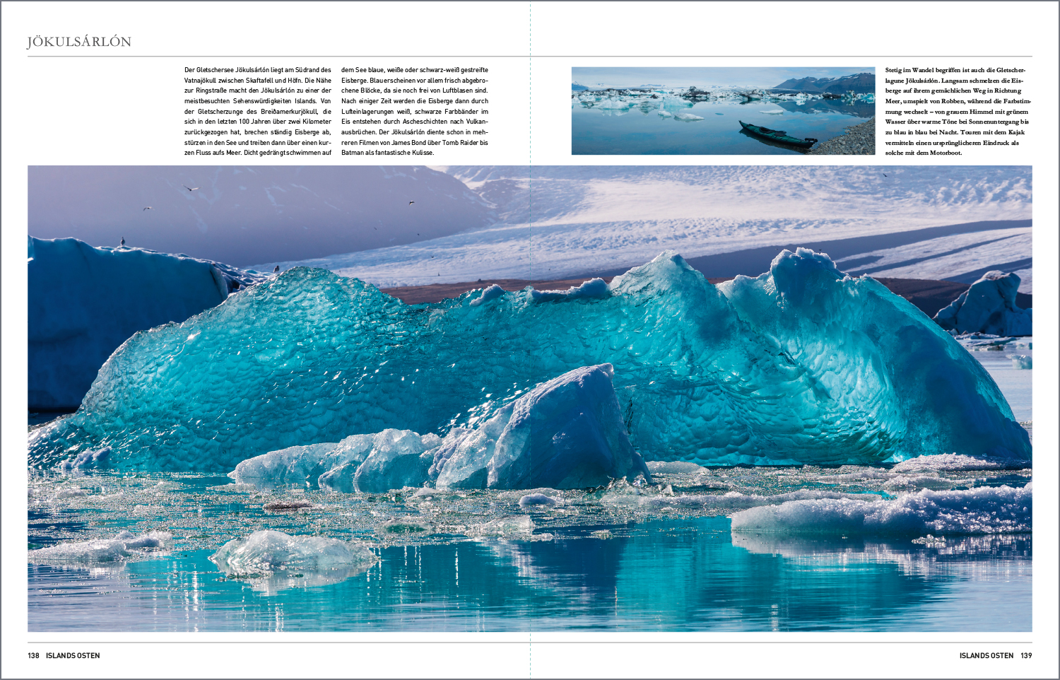 Skeiðarársandur 114, Vatnajökull-Eisschild 116, Subglaziale Eruptionen - Der Grimsvötn 118, Skaftafell, Skaftafellsjökull 120, Svartifoss 122, Hvannadalshnúkur, Öræfajökull 124, Eishöhlen mit dem Durchmesser eines Autobahntunnels 126, Ingólfshöfði 128, Vatnajökull-Nationalpark 130, Fjallsárlón 136, Jökulsárlón 138, Hornafjörður 140, Stokksnes 140, Höfn 142, Isländische Gaumenfreuden 144