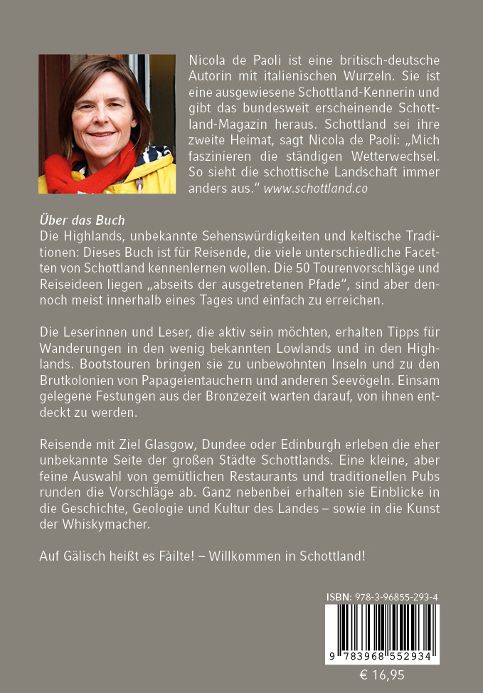 Nicola de Paoli ist eine britisch-deutsche Autorin mit italienischen Wurzeln. Sie ist eine ausgewiesene Schottland-Kennerin und gibt das bundesweit erscheinende Schottland-Magazin heraus. Schottland sei ihre zweite Heimat, sagt Nicola de Paoli: „Mich faszinieren die ständigen Wetterwechsel. So sieht die schottische Landschaft immer anders aus.“
