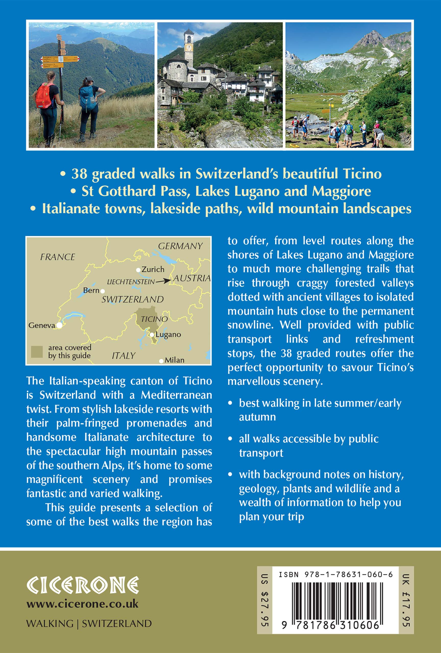 A guidebook describing 38 walks in Ticino, Switzerland. Exploring the lakes and mountains of this beautiful Italianate region, routes are graded by difficulty, from gentle strolls suitable for family outings to strenuous mountain routes sometimes involving scrambling.