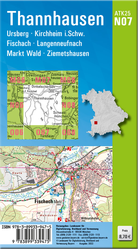 Wer es genau wissen will, greift zur ATK25. Diese Kartenserie im Maßstab 1:25000 bildet mit ihrer detaillierten Darstellung das komplette Verkehrsnetz mit allen Straßen und Wegen ab.237 Einzelblätter stellen Bayern flächendeckend dar. Ein Kartenblatt umfasst ca. 21 km x 22 km.Was bietet die ATK25?- individuelle Freizeitgestaltung mit allen ausgeschilderten Wander- und Radwanderwegen- sichere Orientierung auch abseits der markierten Routen- umfangreiches Spektrum an Freizeiteinrichtungen und Sehenswürdigkeiten- anschauliche Wiedergabe der GeländeformenKartenblatt ATK25-N07 Thannhausen:REGION: Schwaben, Stauden, ReischenauORTE: Thannhausen, Ursberg, Kirchheim i.Schw., Fischach, Langenneufnach, Markt Wald, Ziemetshausen