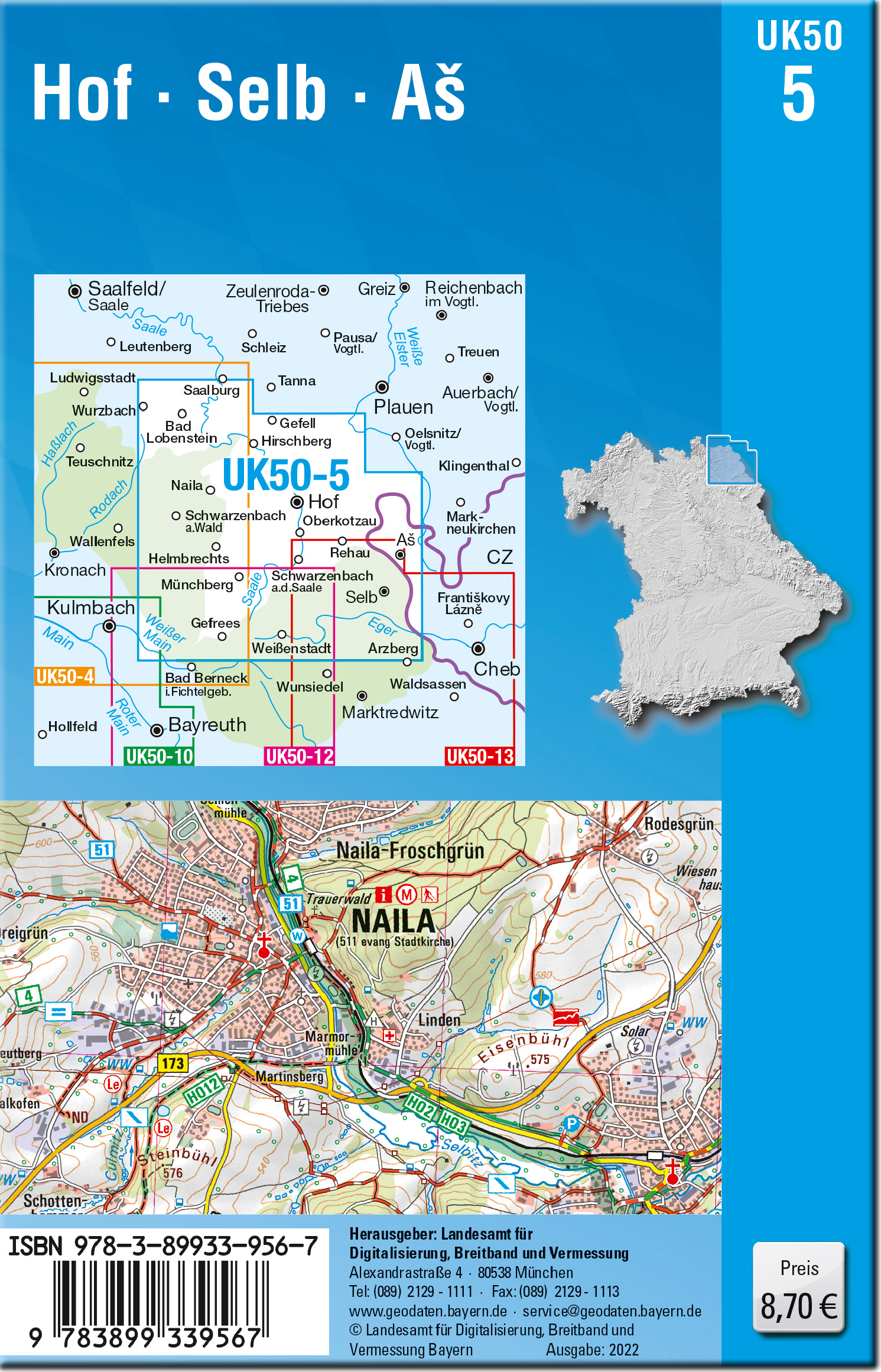 Die amtliche Reihe der UK50 (Umgebungskarte 1:50000) bietet für zusammenhängenden bayerische Regionen gezielte Freizeitinformationen.Kartengrundlage ist die TK50 (Topographische Karte 1:50000) mit UTM-Gitter für GPS-Nutzer und Geländedarstellung.Die UK50-5 zeigt Teile von Frankenwald und Naturpark Fichtelgebirge. Im Norden der Karte wird die Grenzregion Vogtland abgebildet. Überregional bekannt ist die an der Saale gelegene Stadt Hof und die Porzellan-Metropole Selb.Fernradfahrer führt der beliebte Saaleradweg "Durch Bayerns steinreiche Ecke" zu den Städten Münchberg, Gefrees und Oberkotzau. Einwandfrei ausgeschildert geht's vorbei an faszinierenden Felsformationen und zahlreichen geologischen Besonderheiten. MTB-Fans finden rund um Schwarzenbach am Wald und im gesamten Fichtelgebirge ein reiches Betätigungsfeld. Weitwanderer müssen auf jeden Fall nach Blankenstein in Thüringen: Dieses "Drehkreuz des Wanderns" ist Anfangs- (oder End-) Punkt von Rennsteig, Kammweg, Frankenweg und Fränkischem Gebirgssteig! Der östliche Frankenwald wird durch hunderte Wanderwege, allen voran der Frankenwaldsteig mit seinen zugehörigen Steigla vorbildlich erschlossen. Eine Wanderung durch die Steinachklamm und das "Höllental" genannte untere Selbitztal gilt als besonders empfehlenswert. Das Fichtelgebirge wird durch die Wanderwege des Fichtelgebirgsverein gut erschlossen. Auf dem Großen Kornberg bietet der Aussichtsturm Schönburgwarte einen schönen Rundblick über die Region. Zum Kraft tanken geht's in das Siebenquell® GesundZeitResort in Weißenstadt. Wer mit Kindern reist, möchte vielleicht die Schaubergwerke in Kupferberg und Lichtenberg besuchen oder auf dem Thüringer Meer (Bleilochtalsperre) eine Schifffahrt unternehmen. Kleinere Kinder werden sich über den Märchenwald in Saalfeld freuen.Kartenblatt UK50-5 Hof, Selb, AsREGIONEN: Oberfranken, Frankenwald, FichtelgebirgeORTE: Hof, Münchberg, Rehau, Helmbrechts, Naila, Schwarzenbach a.d.Saale, Bad Lobenstein, Oberkotzau, Schwarzenbach a.Wald, Gefrees