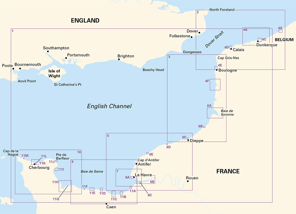 A convenient A2 format chart pack of Hauts-de-France and Normandy coasts provided in a sturdy plastic wallet.
