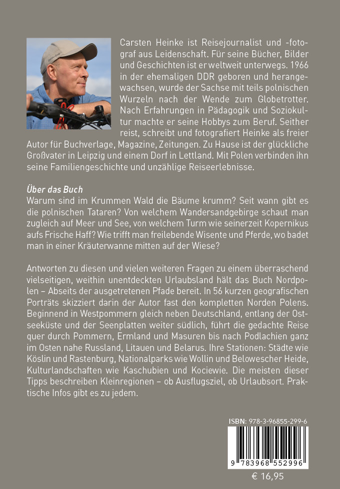 Carsten Heinke ist Reisejournalist und -fotograf aus Leidenschaft. Für seine Bücher, Bilder und Geschichten ist er weltweit unterwegs. 1966 in der ehemaligen DDR geboren und herangewachsen, wurde der Sachse mit teils polnischen Wurzeln nach der Wende zum Globetrotter. Nach Erfahrungen in Pädagogik und Soziokultur machte er seine Hobbys zum Beruf. Seither reist, schreibt und fotografiert Heinke als freier Autor für Buchverlage, Magazine, Zeitungen. Zu Hause ist der glückliche Großvater in Leipzig und einem Dorf in Lettland. Mit Polen verbinden ihn seine Familiengeschichte und unzählige Reiseerlebnisse.