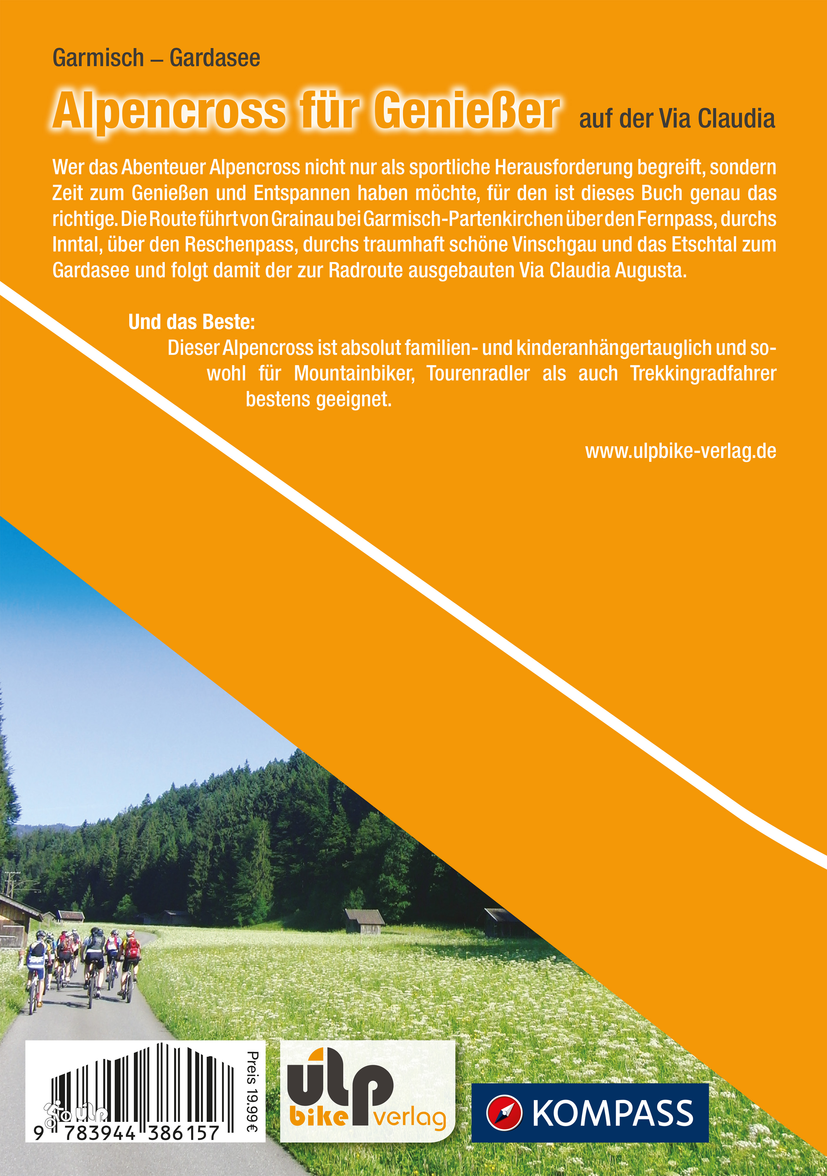 Wer das Abenteuer Alpencross nicht nur als sportliche Herausforderung begreift, sondern Zeit zum Genießen und Entspannen haben möchte, für den ist dieses Buch genau das richtige. Die Route führt von Grainau bei Garmisch über den Fernpass, durchs Inntal, über den Reschenpass, durchs traumhaft schöne Vinschgau und das Etschtal zum Gardasee und folgt damit der zur Radroute ausgebauten alten Römerstraße Via Claudia Augusta. Und das Beste: Diese Route ist absolut familien- und anhängertauglich und sowohl für Mountainbiker, Tourenradler und Trekkingradfahrer bestens geeignet.