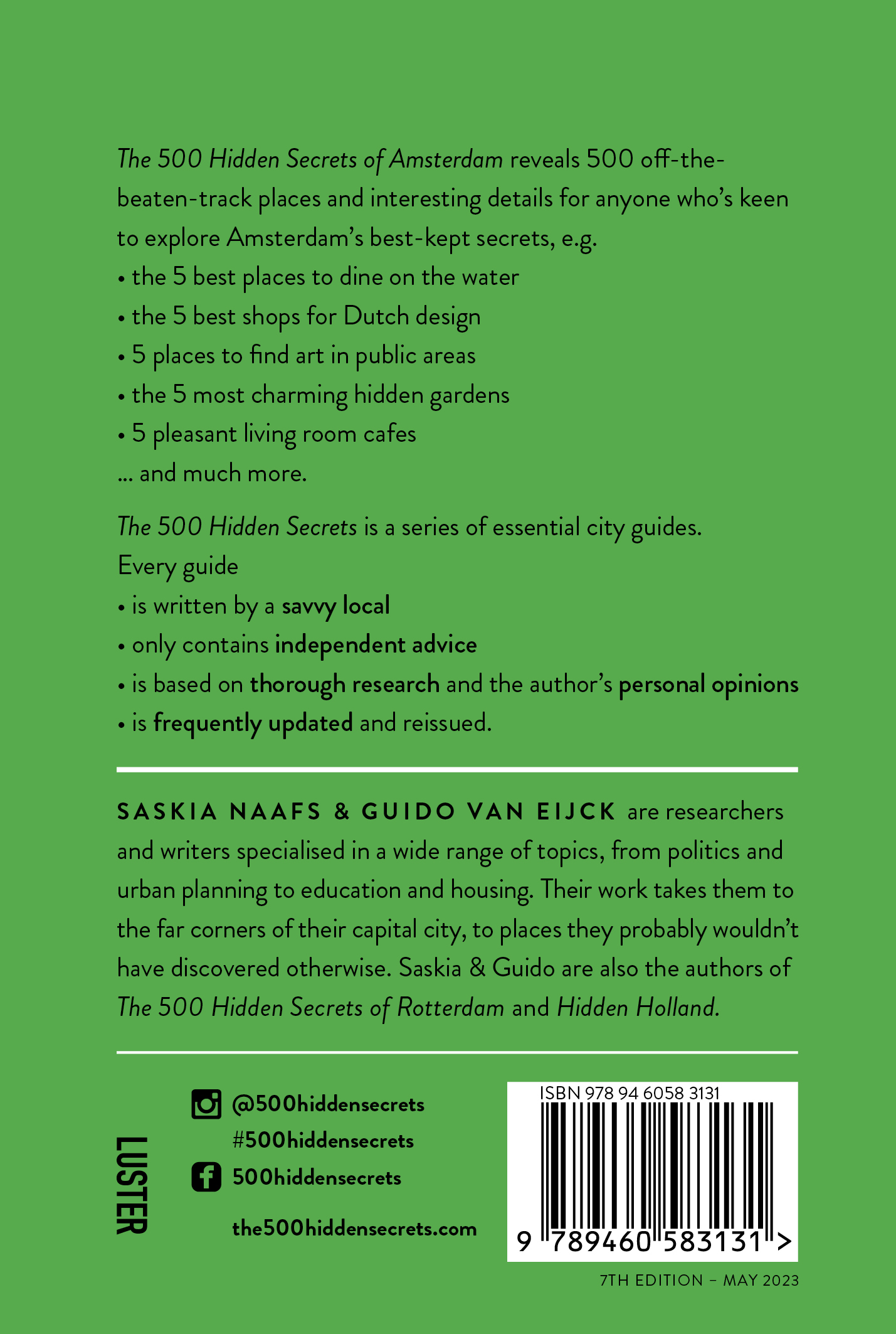 Saskia Naafs & Guido Van Eijck are researchers and writers specialised in a wide range of topics, from politics and urban planning to education and housing. Their work takes them to the far corners of their capital city, to places they probably wouldn’t have discovered otherwise. Saskia & Guido are also the authors of The 500 Hidden Secrets of Rotterdam and Hidden Holland.