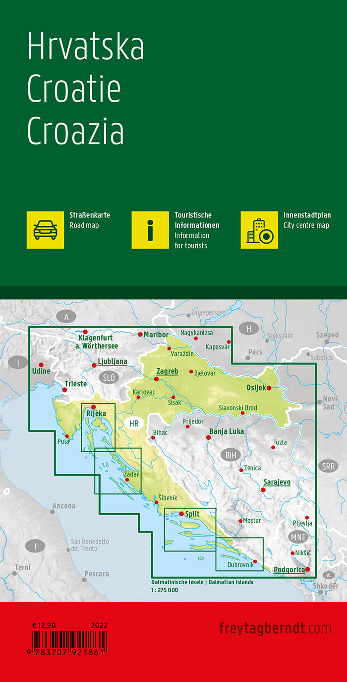 Mit der Straßenkarte Kroatien im Maßstab 1:500.000 finden sich Urlauber die mit Auto, Motorrad oder Wohnwagen unterwegs sind bestens zurecht. Das weit verzweigte Straßennetz ist exakt abgebildet, Entfernungen und viele Ausflugsziele sind in der Karte eingezeichnet.