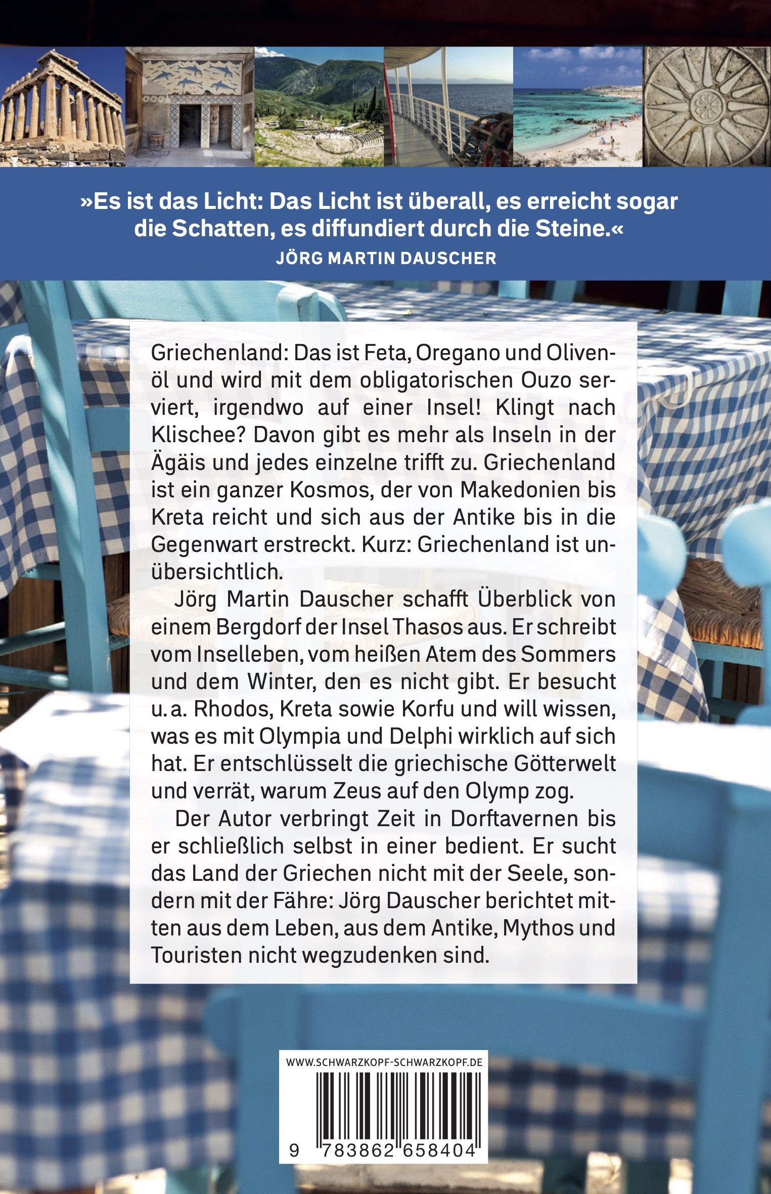 Griechenland: Das ist Feta, Oregano und Olivenöl und wird mit dem obligatorischen Ouzo serviert, irgendwo auf einer Insel! Klingt nach Klischee? Davon gibt es mehr als Inseln in der Ägäis und jedes einzelne trifft zu. Griechenland ist ein ganzer Kosmos, der von Makedonien bis Kreta reicht und sich aus der Antike bis in die Gegenwart erstreckt. Kurz: Griechenland ist unübersichtlich.Jörg Martin Dauscher schafft Überblick von einem Bergdorf der Insel Thasos aus. Er schreibt vom Inselleben, vom heißen Atem des Sommers und dem Winter, den es nicht gibt. Er besucht u. a. Rhodos, Kreta sowie Korfu und will wissen, was es mit Olympia und Delphi wirklich auf sich hat. Er entschlüsselt die griechische Götterwelt und verrät, warum Zeus auf den Olymp zog.Der Autor verbringt Zeit in Dorftavernen bis er schließlich selbst in einer bedient. Er sucht das Land der Griechen nicht mit der Seele, sondern mit der Fähre: Jörg Dauscher berichtet mitten aus dem Leben, aus dem Antike, Mythos und Touristen nicht wegzudenken sind.