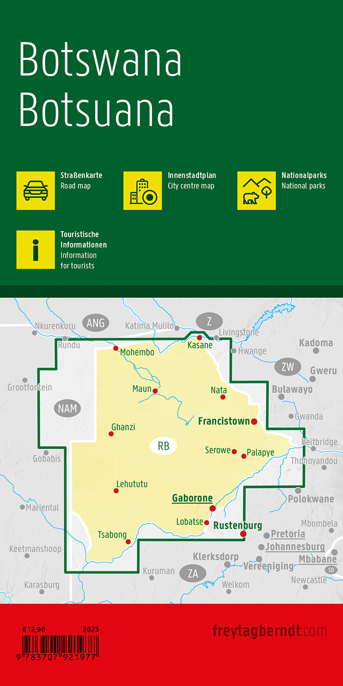 Mit der Straßenkarte Botsuana im Maßstab 1:1.100.000 finden sich Urlauber die mit Auto, Motorrad oder Wohnwagen unterwegs sind bestens zurecht. Das weit verzweigte Straßennetz ist exakt abgebildet, Entfernungen und viele Ausflugsziele sind in der Karte eingezeichnet.