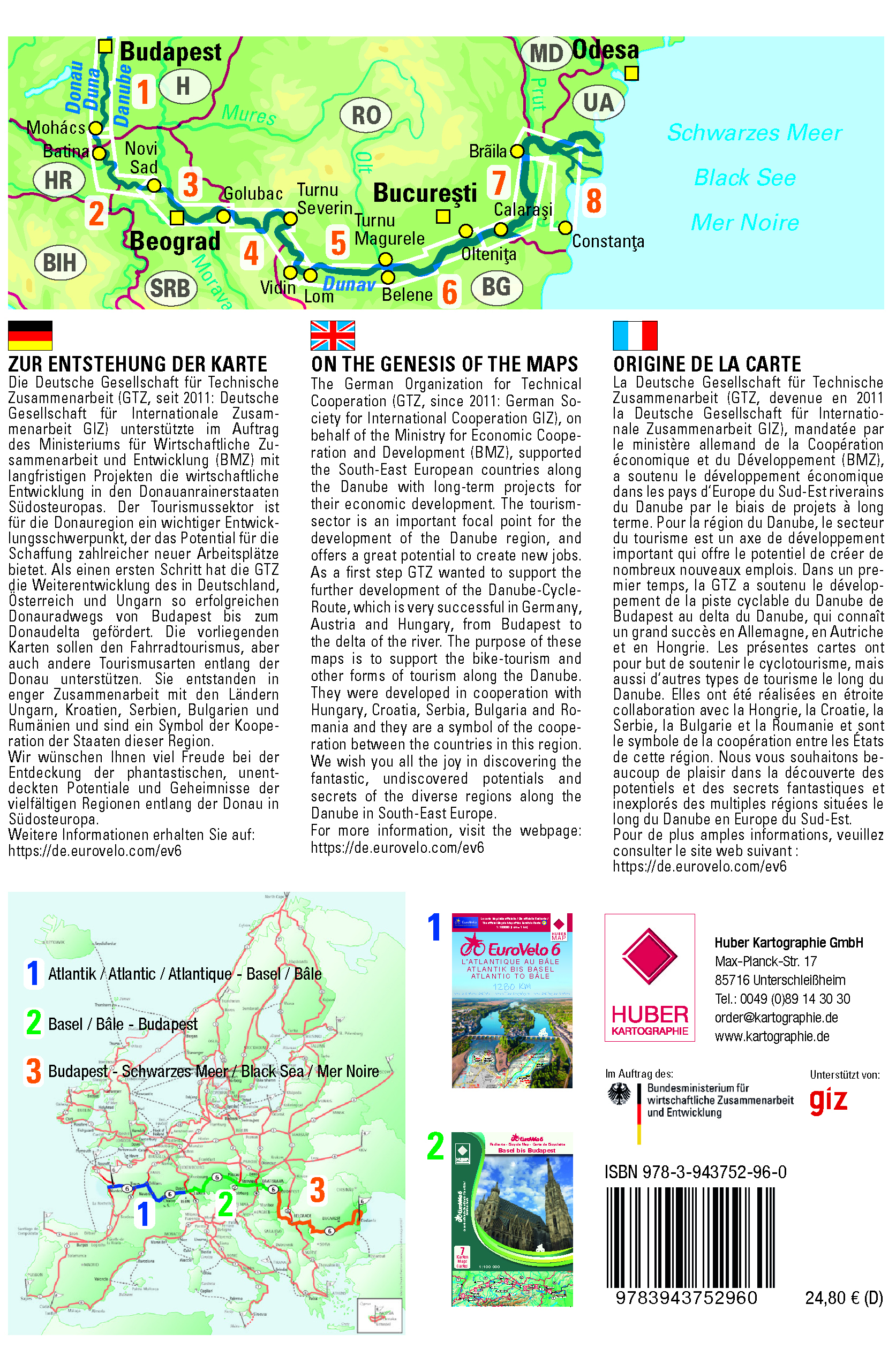 ZUR ENTSTEHUNG DER KARTE Die Deutsche Gesellschaft für Technische Zusammenarbeit (GTZ, seit 2011: Deutsche Gesellschaft für Internationale Zusammenarbeit GIZ) unterstützte im Auftrag des Ministeriums für Wirtschaftliche Zusammenarbeit und Entwicklung (BMZ) mit langfristigen Projekten die wirtschaftliche Entwicklung in den Donauanrainerstaaten Südosteuropas. Der Tourismussektor ist für die Donauregion ein wichtiger Entwicklungsschwerpunkt, der das Potential für die Schaffung zahlreicher neuer Arbeitsplätze bietet. Als einen ersten Schritt hat die GTZ die Weiterentwicklung des in Deutschland, Österreich und Ungarn so erfolgreichen Donauradwegs von Budapest bis zum Donaudelta gefördert. Die vorliegenden Karten sollen den Fahrradtourismus, aber auch andere Tourismusarten entlang der Donau unterstützen. Sie entstanden in enger Zusammenarbeit mit den Ländern Ungarn, Kroatien, Serbien, Bulgarien und Rumänien und sind ein Symbol der Kooperation der Staaten dieser Region. Wir wünschen Ihnen viel Freude bei der Entdeckung der phantastischen, unentdeckten Potentiale und Geheimnisse der vielfältigen Regionen entlang der Donau in Südosteuropa. Weitere Informationen erhalten Sie auf: https://de.eurovelo.com/ev6